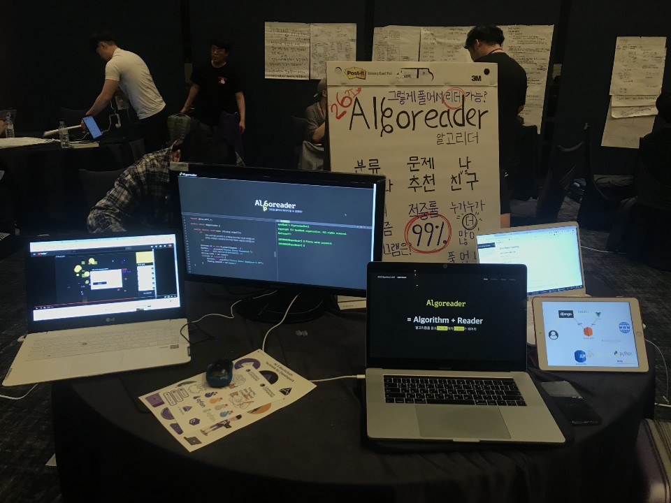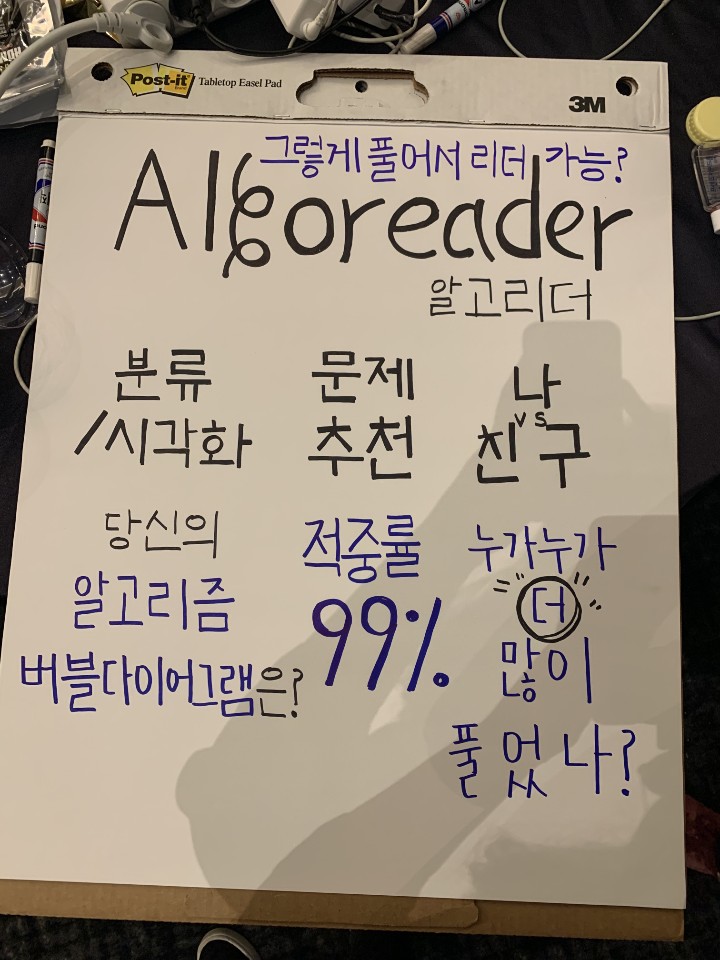 셋째 날 점심까지 개발을 해서 프로젝트를 완성했어요. 저희 프로젝트 이름은 Algoreader였고, 백준 알고리즘 문제 버블 지도 서비스를 만들었습니다. 마지막까지 다들 열심히 해주고 좋은 팀원들을 만나서 재밌는 경험을 할 수 있었던 것 같아요. ㅋㅋ