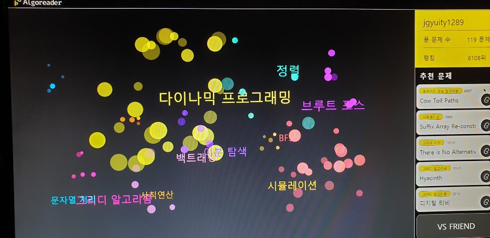 저는 웹에서 사용자들이 푼 문제 정보(문제 번호, 문제 이름, 문제 정답률, 문제 유형 등)를 가지고 그 문제들을 유형으로 그룹핑을 해서 시각적으로 보여주는 부분을 맡았습니다. 원래 목표는 동적으로 움직이는 모션을 보여주고 싶었는데... 역량이 달려서 거기까지는 못했어요 ㅠㅠㅠ mo.js 라이브러리를 쓰면서 삽질을 되게 많이 했고 솔직히 조금 후회도 했던 것 같아요. 그래도 쓰면서 많이 배워서 성장했다는 점에 스스로 위안을 삼았습니다.