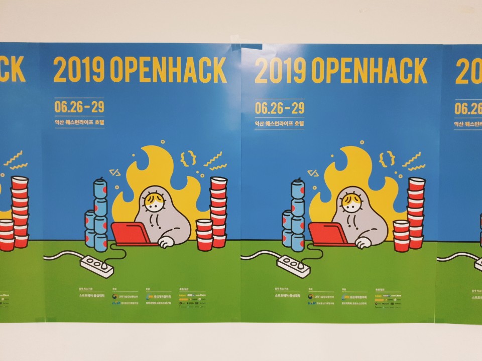 저는 지난 3박 4일(정확히는 2박 4일) 동안 해커톤 대회를 하고 왔어요! 대회 이름은 '오픈핵 2019 (Openhack 2019)'였고 전국에 있는 소프트웨어 중심대학 개발자들과 디자이너들이 참여해서 진행하는 해커톤입니다.