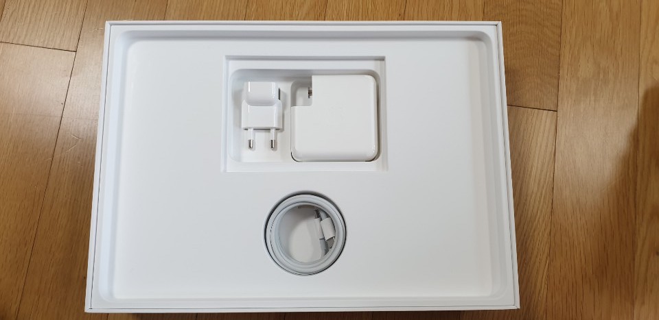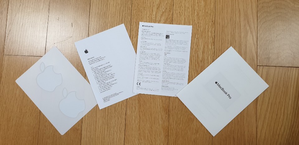 구성은 정말 심플했어요. 맥북과 충전기, 그리고 설명서와 스티커 2장.