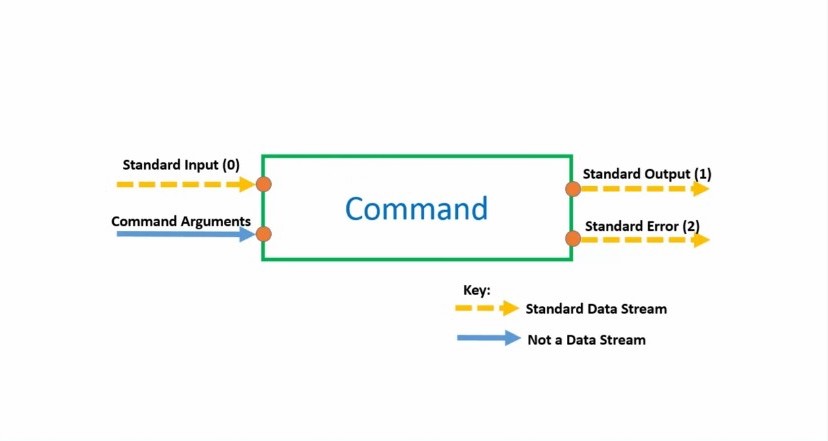 그림에서 보는 것 처럼 Data Stream은 Standard Input(0), Standard Output(1), 그리고 Standard Error(2) 이렇게 세 가지가 있고 커맨드가 Arguments를 받는 건 Data Stream이라고 하지 않는다. 즉, 두 가지 방법으로 데이터를 받고, 두 가지 방법으로 데이터를 보내는 것이다.
