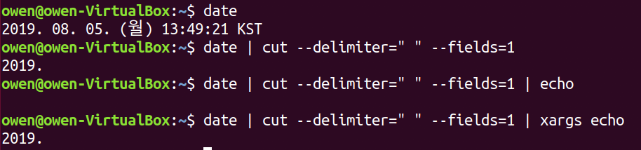파이프(|)를 통해서 date에서 생성된 데이터(2019. 08. ...)를 그 뒤에 새로운 커맨드에서 cut 명령어를 통해서 다룰 수 있다. 위의 그림처럼 command1(date)의 출력값을 command2(cut)의 입력값으로 연결한 것이며 연결시킬 수 있는 파이프의 갯수에는 제한이 없다.