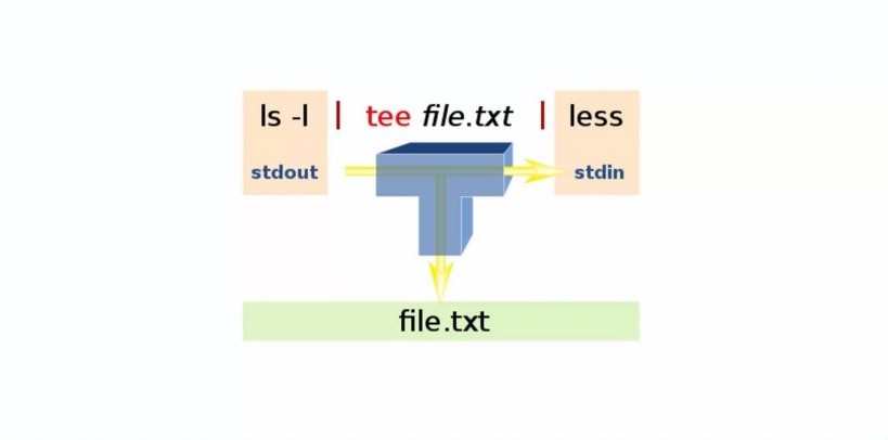이러한 동작을 할 수 있는 명령어가 바로 tee 이다. T형 파이프를 통해 물이 오른쪽과 아래로 빠져나가는 것을 생각하면 이해하기가 쉽다.