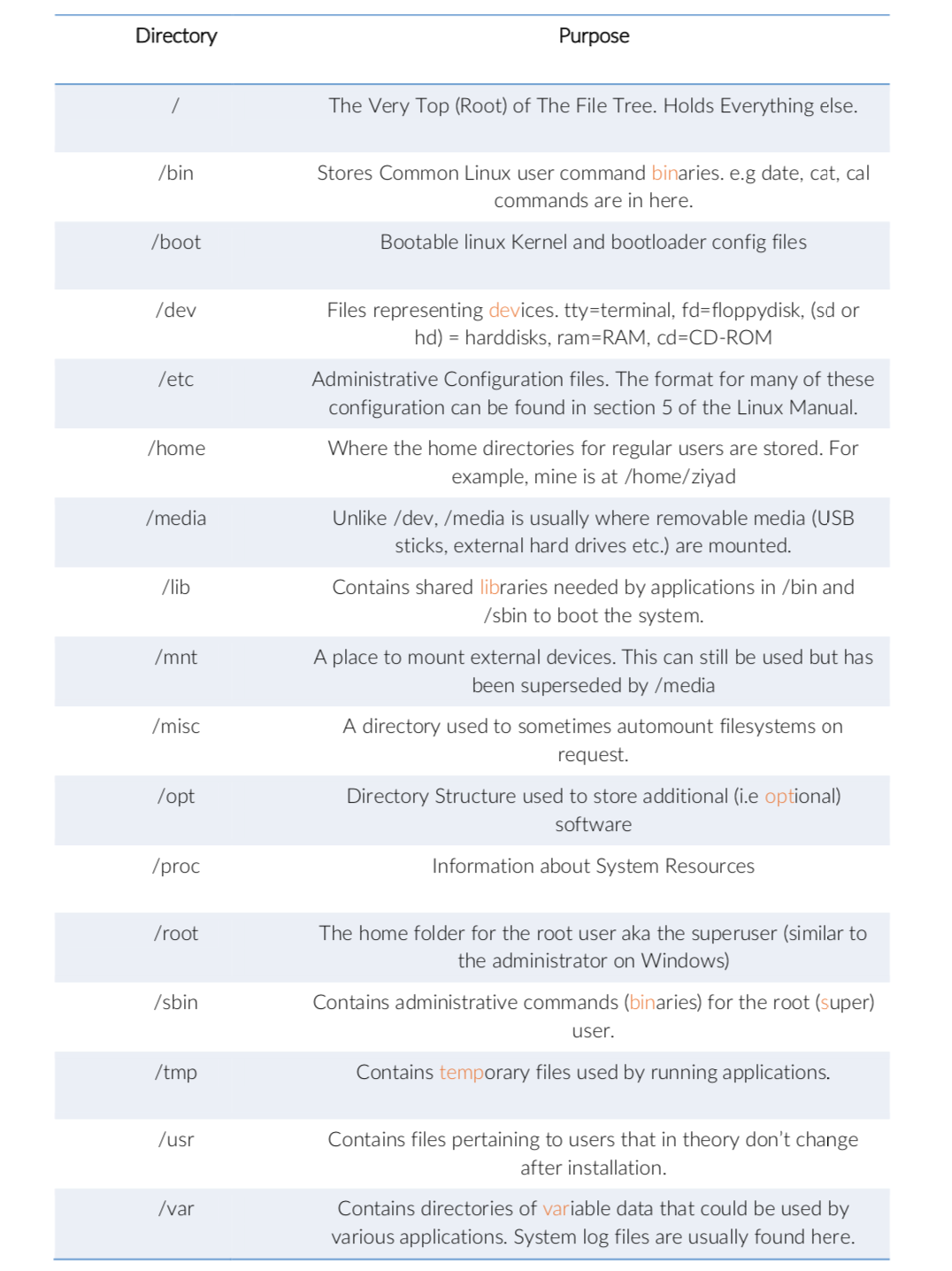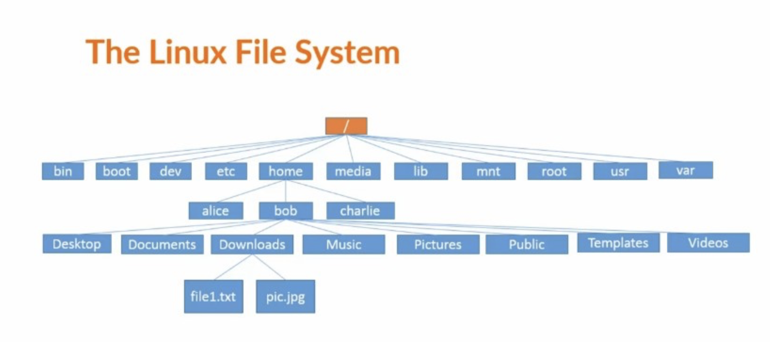 전체 파일 시스템은 다음과 같고 가장 위의 '/'를 root 라고 합니다. 그리고 그 아래를 sub directory라고 하죠. 서브 디렉토리 중에서 /home의 경우 모든 일반 사용자들의 홈 디렉토리를 가지고 있습니다.(ex. alice, bob, ...) 터미널에 'cd ~'라고 입력을 하게 되면 홈 디렉토리로 이동을 하게 됩니다. 각각의 디렉토리 별로 자세한 설명은 아래에 첨부한 사진을 참고해주세요.