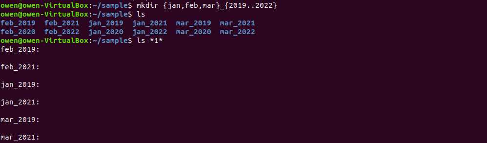 위의 사진처럼 두개 이상의 {}로 파일이나 디렉토리를 생성할 수 있습니다 jan,feb,mar 3개의 이름이 앞에 나오고 뒤에는 숫자가 4개가 나오므로 3*4=12개의 파일을 단 한 줄의 명령어로 만들 수가 있어요. 여기서 이렇게 디렉토리를 만들면서 하위에 파일까지 한 번에 만드는 것도 물론 가능합니다 ㅎㅎ