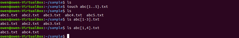 비어있는 sample 디렉토리에 파일을 5개 생성하고 싶습니다. 파일 명은 abc1.txt, abc2.txt, .. 이런 식으로 말이죠. 물론 5개 정도면 일일이 직접 만들어 줄 수 있지만 갯수가 50개, 500개가 되면 이야기가 달라집니다. 이 때 파일을 생성하는 touch 명령어를 사용하여 파일명에서 바뀌는 숫자 부분만 {1..5} 이렇게 적어준다면 이 부분이 숫자 1 부터 5까지로 지정된 파일 5개가 생성이 되게 됩니다.