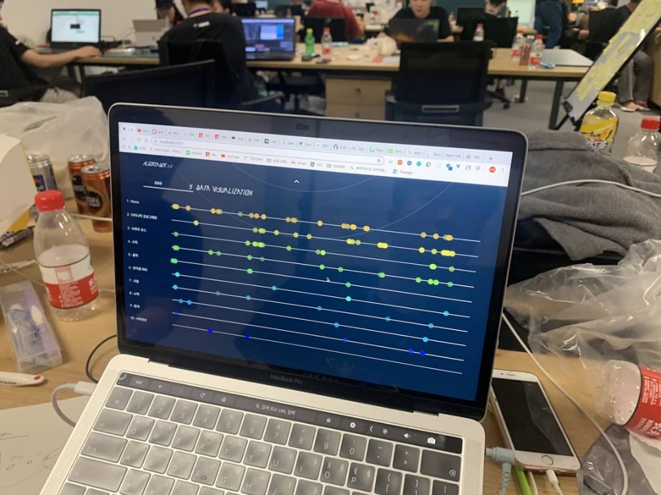 우리 팀은 어느정도 기획을 전날 저녁에 마무리 한 상태에서 해커톤을 시작했다. 우리 서비스 이름은 알고리더(Algoreader)이고, 백준 알고리즘 문제풀이 데이터를 기반으로 버블 형태 문제 지도를 보여준 뒤에 AI 기반 문제 추천을 해주는 서비스이다. 따로 기획을 더 하지 않고 각자 파트를 맡아서 개발을 시작했다. 나는 웹 프론트엔드 개발을 맡았고 vue.js를 썼으며 anime.js 라는모션그래픽 라이브러리도 시도해 보았다. 나머지 팀원들은 백엔드 한 명, 머신러닝 엔지니어 두 명, 그리고 UI/UX 디자이너 한 명 이었다.
