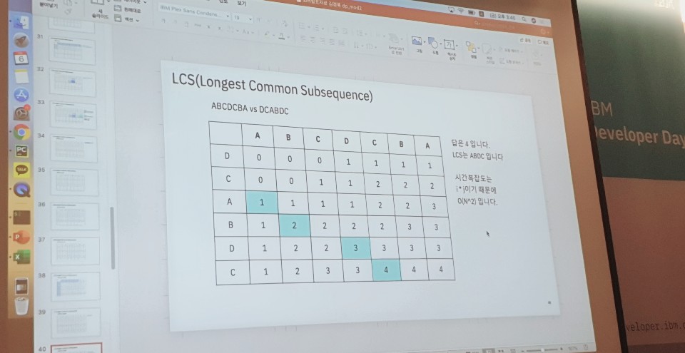 실제로 문제를 하나 풀면서 강의를 해 주셨는데, 다이나믹 프로그래밍(Dynamic programming)에 대한 문제를 풀었어요. LCS(Longest Common Subsequence) 문제였는데 겹치는 문자열 중 가장 긴 문자열의 길이를 구하는 문제였습니다. 다이나믹 프로그래밍은 배열을 만들어서 연산한 값을 그 배열에 넣은 뒤 참조해서 사용하는 문제로, 시간복잡도를 확실히 줄일 수 있다는 장점이 있습니다.