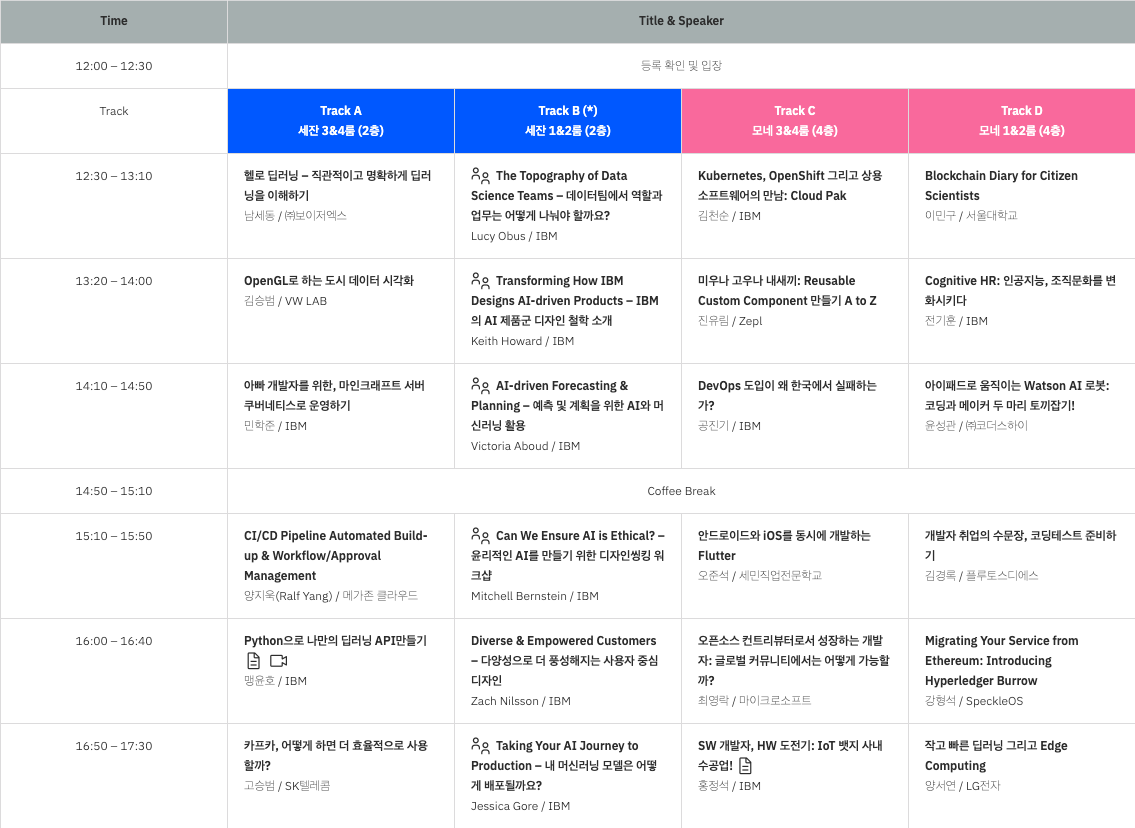 발표 분야는 정말 다양했던 것 같아요. 웹, 딥러닝, 머신러닝, 블록체인, 클라우드 등등 주제로 발표가 이루어 졌고 IBM이 아닌 외부에서 오신 연사님들도 정말 많았어요. 저는 처음부터 순서대로 Track A, C, C, D, C, D 이렇게 들었습니다. 추후에 발표 자료나 영상은 공식 홈페이지에 업로드 된다고 하니 참고하시면 될 것 같아요!
