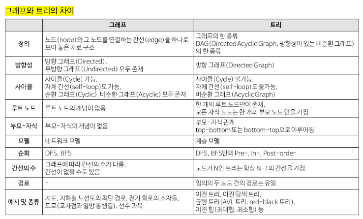그래프(Graph)는 노드(node)와 그 노드를 연결하는 간선(edge)을 하나로 모아놓은 자료구조이다. 즉, 연결되어 있는 객체 간의 관계를 표현할 수 있다. 예를 들면 지하철에서 다른 역으로 가는 최단 경로를 찾아주는 서비스도 그래프 알고리즘을 사용한다. 그래프의 한 종류로 트리 자료구조가 있는데 그래프와 트리의 차이는 다음과 같다.