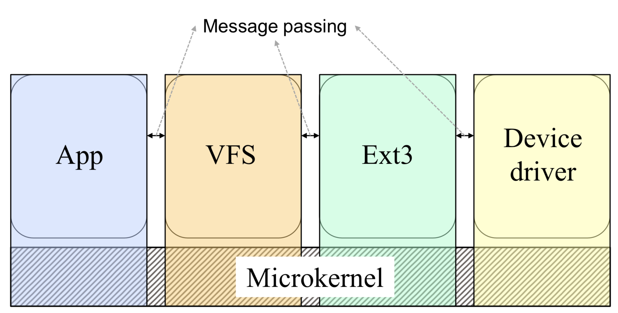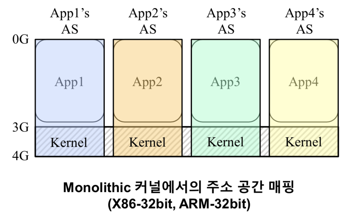 - 장점 : 어플리케이션과 모든 커널 서비스가 같은 주소 공간에 위치하기 때문에, 시스템 콜 및 커널 서비스 간의 데이터 전달 시 오버헤드가 적음