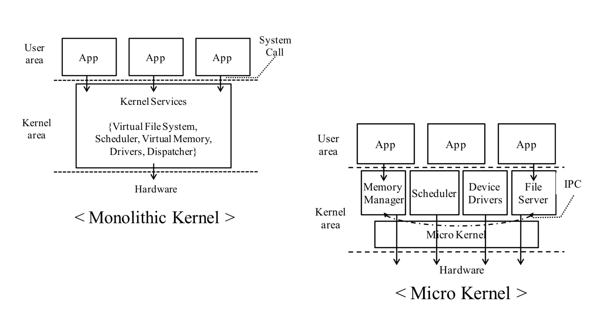 - 마이크로 커널은 서버들 간의 통신(IPC), 어플리케이션의 서비스 콜 전달과 같은 단순한 기능만 제공