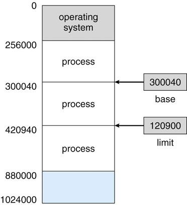 첫 번째로, 운영체제는 각 프로세스들이 메모리에 올라왔을 때 다른 프로세스의 메모리 공간을 접근하는 것을 막아야 한다. 이를 위해서 메모리에서 프로세스의 시작 위치를 저장하는 Base Register와 프로세스에 할당된 메모리의 크기인 Limit Register 값을 이용해 프로세스의 메모리 공간의 경계를 나눈다. 즉 아래의 그림에서는 300040(BR) <= 프로세스가 접근할 수 있는 공간 <= 420940(BR+LR) 의 범위를 가짐을 알 수가 있다.