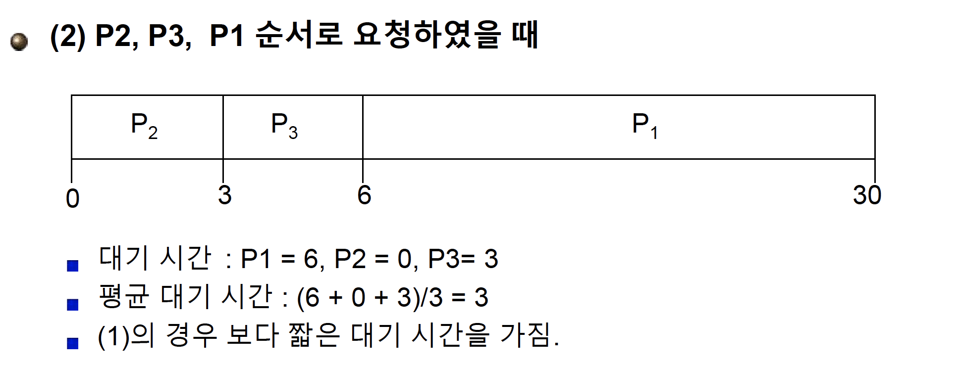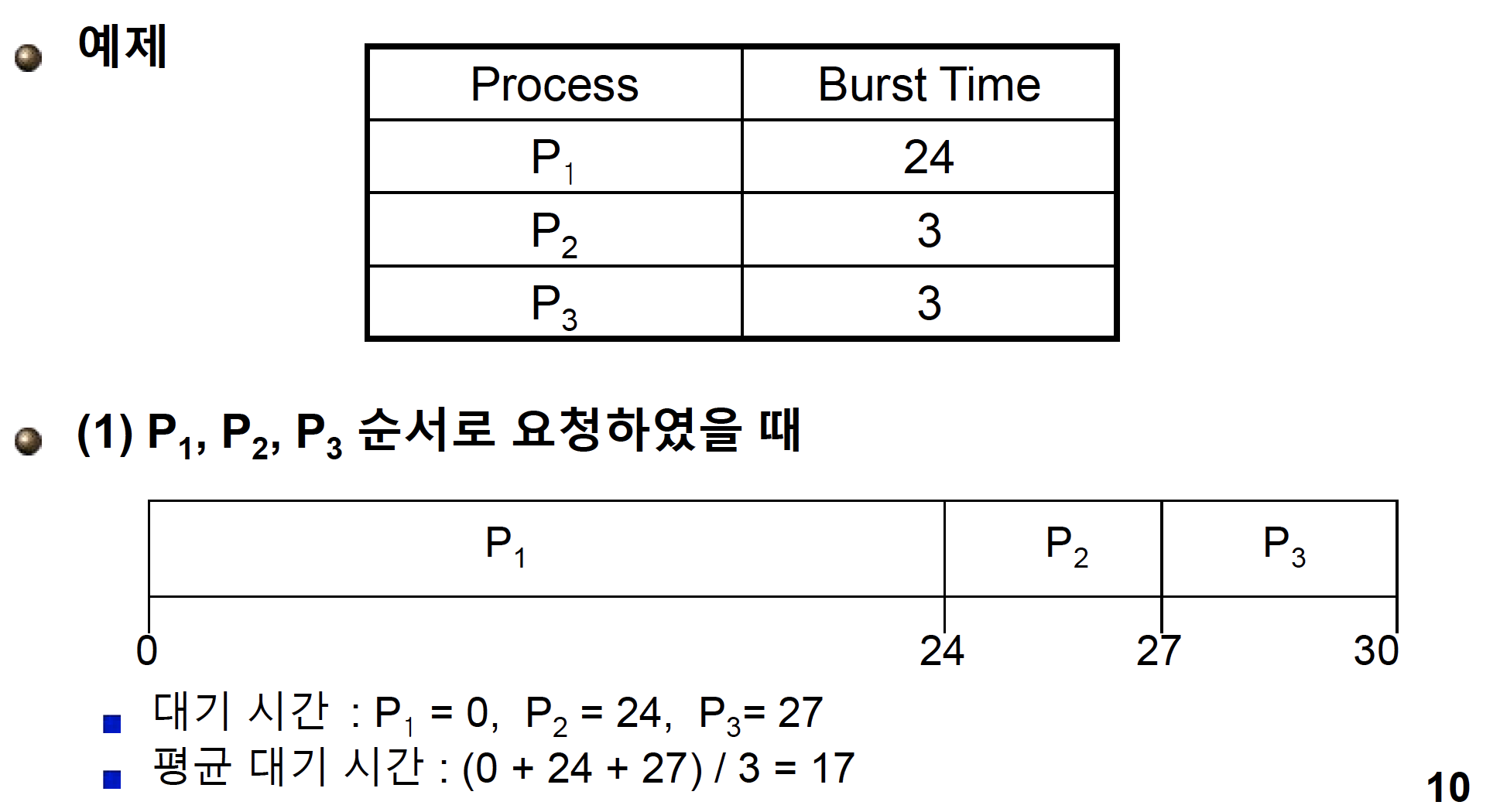 선착순 방식의 스케줄링으로 비선점형 스케줄링이다. Ready Queue에 있는 순서대로 CPU를 할당한다. 작업의 순서에 따라서 대기 시간이 변할 수 있다.