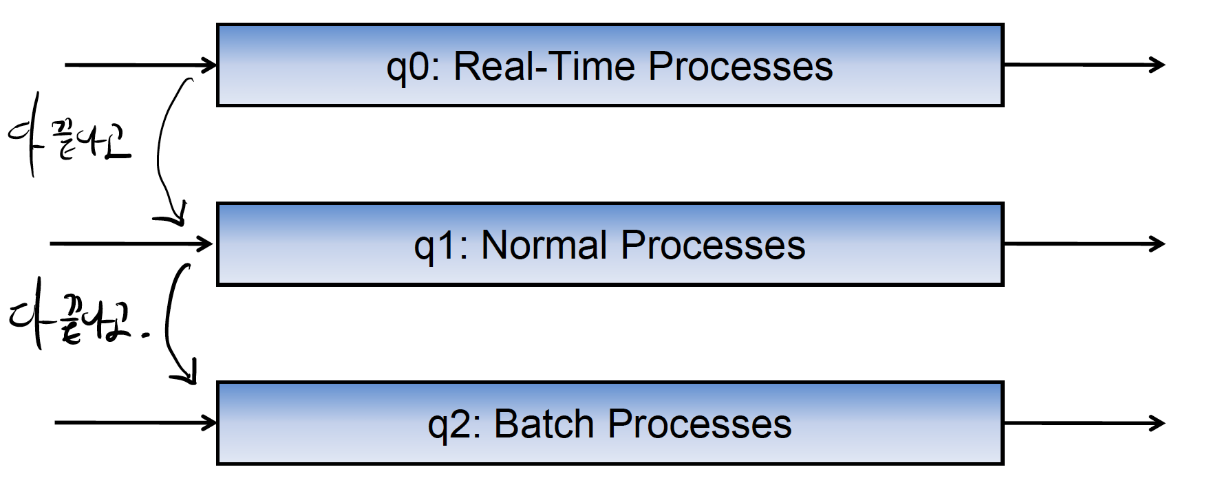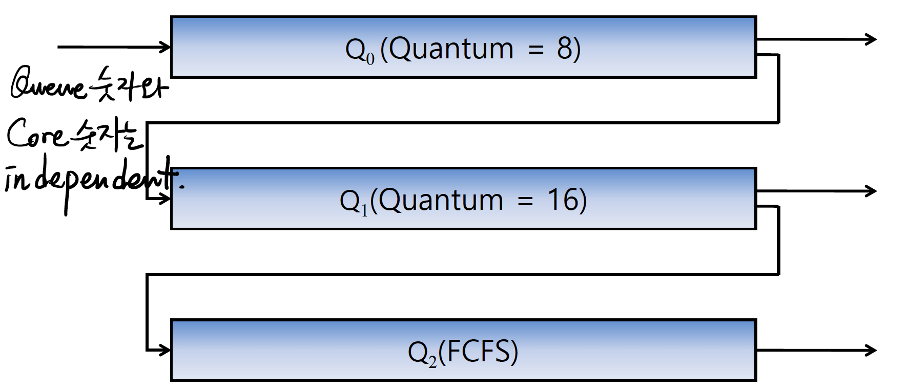 아래의 그림은 3 단계 피드백 큐 스케줄링이다. Q0는 시간 단위가 8ms이고, Q1은 시간 단위가 16ms이며 Q2는 FCFS 방식이다. 새로운 프로세스가 들어오면 Q0에서 8ms 동안 수행이 되며, Q0에서 끝나지 않은 프로세스는 Q1으로 이동한다. Q1에서는 16ms동안 수행이 되며, 여기서도 종료되지 않은 경우 많은 CPU 작업이 필요한 프로세스라고 판단, Q2로 이동하여 FCFS 방식으로 수행된다.