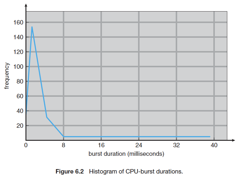 CPU burst가 긴 경우는 CPU-bound 프로세스라고 하고, CPU burst가 짧은 경우는 I/O-bound 프로세스라고 한다. 어떤 종류의 프로세스가 많은지에 따라 스케줄링 기법의 효율성이 달라진다. 아래는 CPU-burst time의 빈도수를 나타낸 그래프인데, 이러한 데이터를 바탕으로 time quantum은 10ms로 설정이 되었다.