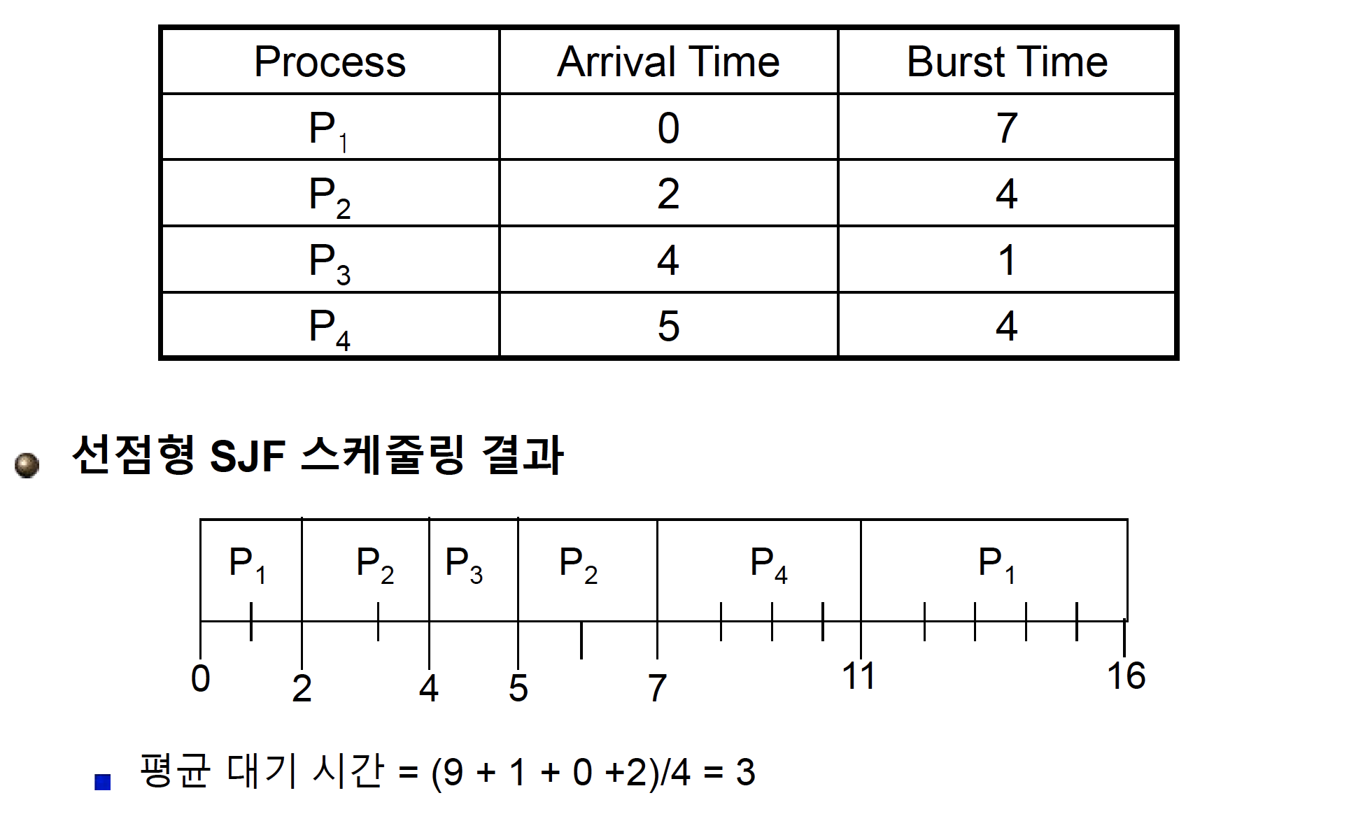 아래는 선점형 스케줄링 방식은 SJFS이다.