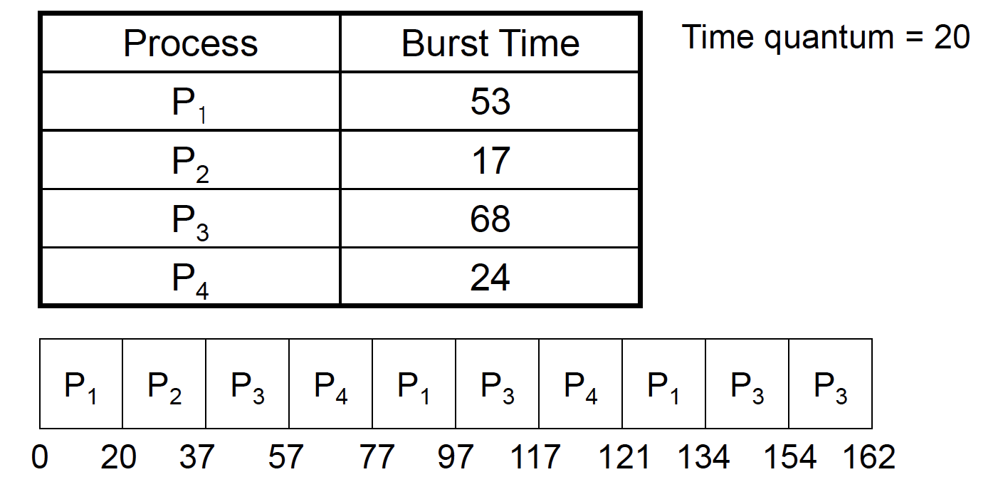 RR의 장점은 response time이 짧다는 점이다. 이는 Interactive 프로세스에 필요하다. 성능적인 면에서 살펴보면 시간 단위가 클 경우 FCFS 스케줄링과 비슷해 지고, 시간 단위가 만약 문맥 전환(Context Switching)에 필요한 시간보다 작을 경우는 문맥 전환이 일어날 때 마다 오버헤드가 발생하여 효율이 매우 떨어질 수 있다.