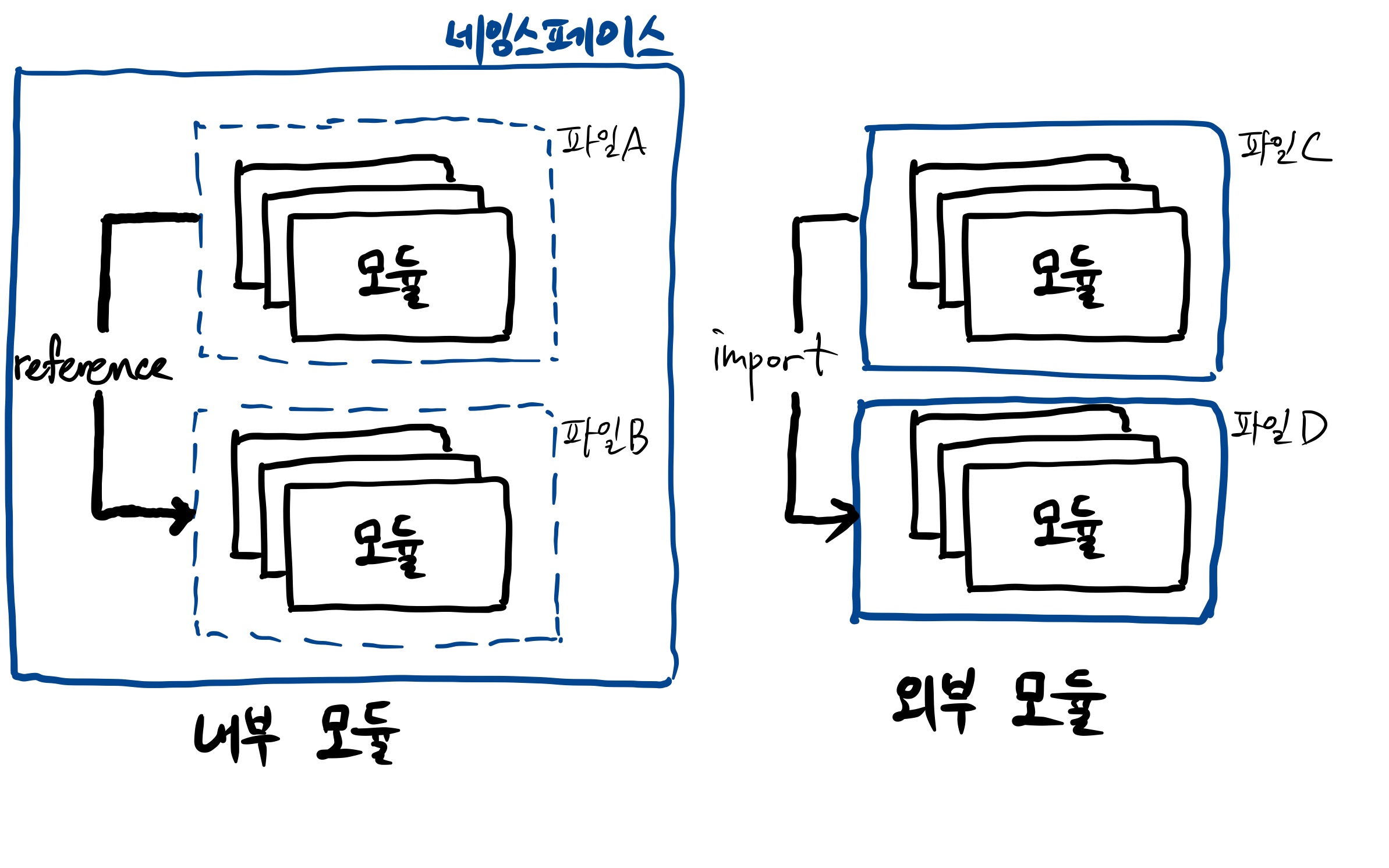 내부 모듈인 네임스페이스는 전역 이름 공간과 분리된 네임스페이스 단위의 이름공간이다. 따라서 같은 네임스페이스의 이름 공간이라면 파일 B가 파일 A에 선언된 모듈을 참조(reference)할 수 있는데 참조할 때는 별도의 참조문을 선언할 필요가 없다. 같은 네임스페이스 안에서는 이름을 중복해서 클래스, 함수, 변수 등을 선언할 수 없다. 하지만 다른 네임스페이스 간에는 이름이 같아도 충돌이 없다.