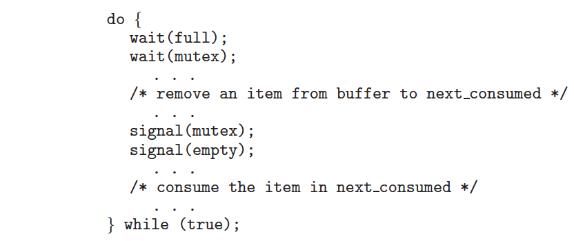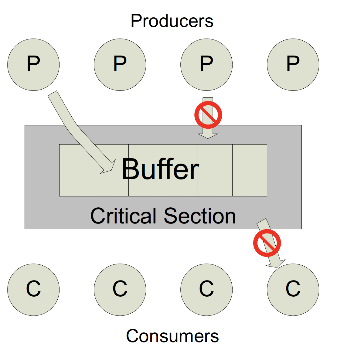이 문제는 N개의 버퍼에 여러 생산자와 여러 소비자가 접근할 때 발생하는 문제이다. 여기에서 생산자(producer)는 하나의 아이템을 생산해 버퍼에 저장하는 역할을 하며, 동작 조건은 버퍼 내에 저장할 공간이 있어야 한다는 것이다. 반대로 소비자(consumer)는 버퍼에서 하나의 아이템을 가져오는 역할을 하며, 동작 조건은 버퍼 내에 소비할 아이템이 있어야 한다는 것이다. 생산자와 소비자가 충돌 없이 버퍼를 접근할 수 있도록 버퍼는 임계 영역(critical section)이어야 한다.