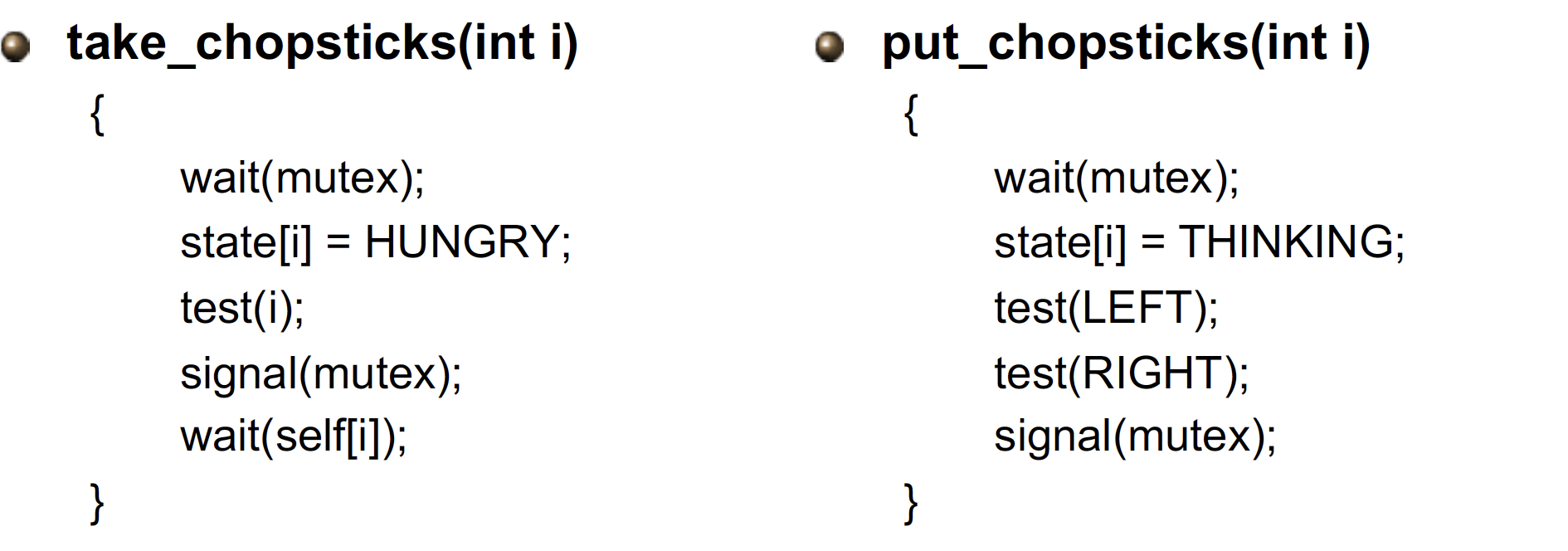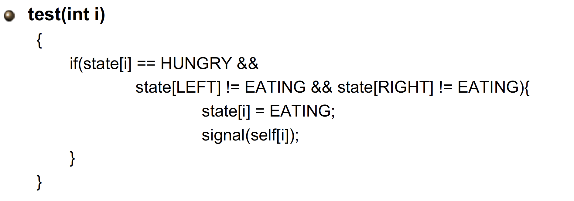 - test(i) : test를 수행한 철학자 i가 HUNGRY 상태이고, 양쪽의 철학자가 모두 젓가락을 집지 않은 상태 not EATING이면 take_chopsticks()에서 wait 했던 자신의 세마포 self[i]에 signal을 보내 eating 상태로 진행