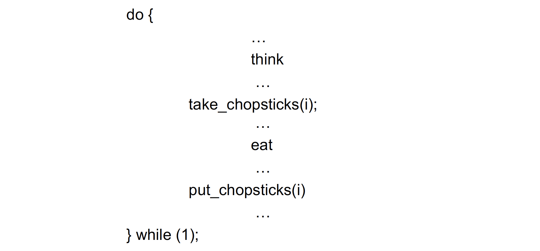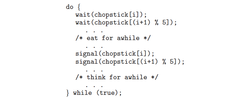 하지만 문제는 두 철학자가 동시에 chopstick[i]를 잡으면 데드락이 발생한다는 점이다. 그래서 이러한 상황이 일어나지 않게 다른 개선 방법을 고민해 보아야 한다. 한 번에 철학자를 4명만 식탁에 둘 수도 있고, 젓가락의 상태를 미리 검사해서 두 젓가락이 모두 사용 가능한 경우만 사용할 수 있게 하는 방법도 있을 수 있다. 또한 철학자에게 번호를 부여하여 홀수인 철학자는 왼쪽의 젓가락을, 짝수인 철학자는 오른쪽의 젓가락을 먼저 집도록 하는 방법도 있다. 하지만 이러한 방법들은 기아 현상까지 해결해 주지는 못한다.