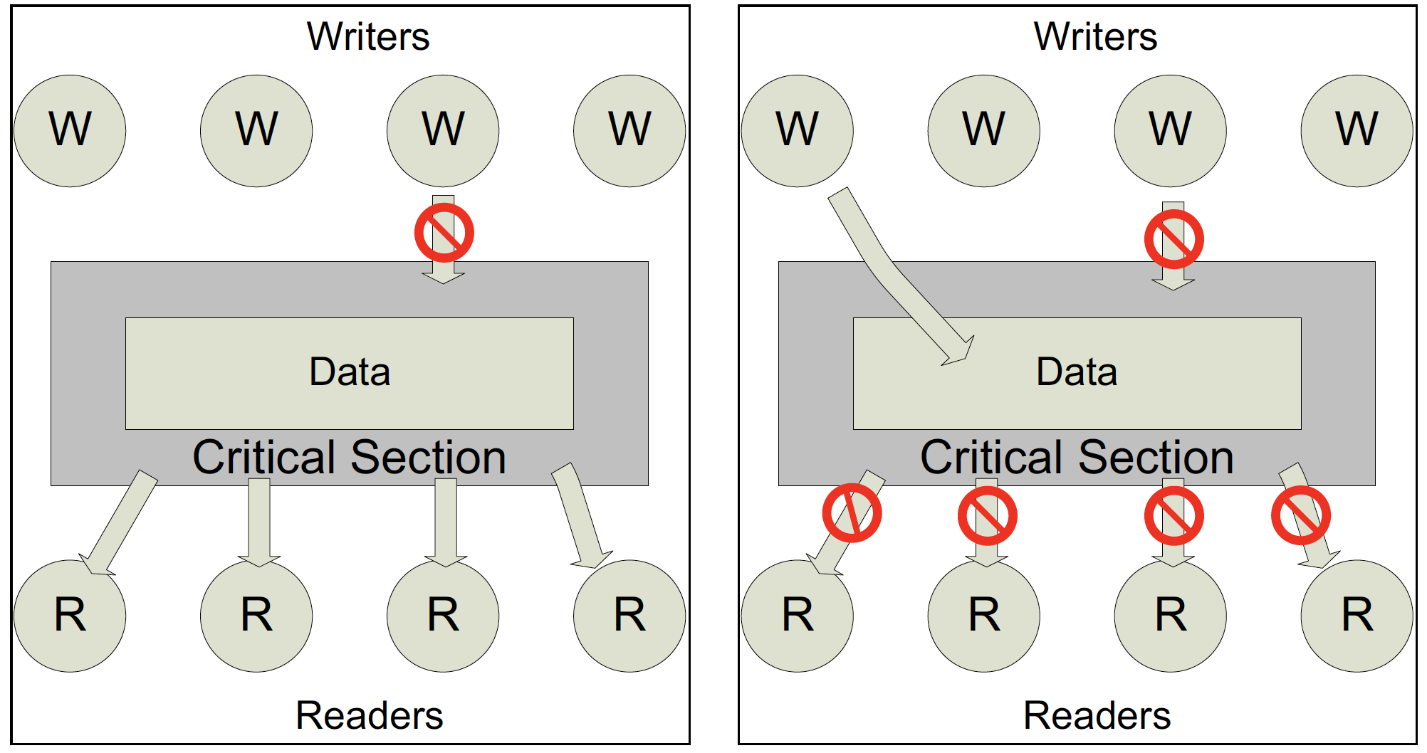 이 문제는 여러 reader와 writer가 하나의 공유 데이터를 읽거나 쓰기 위해 접근하는 상황이다. 여러 Reader가 동시에 데이터를 읽을 수 있다. writer는 공유 데이터에 쓸 수 있는데, 이 때 reader 또는 다른 writer가 작업을 하고 있지 말아야 한다. 즉 READ는 동시에 여럿이 가능하지만 WRITE는 한 번에 하나만 가능하다는 것이다. 아래의 도식을 살펴보자.