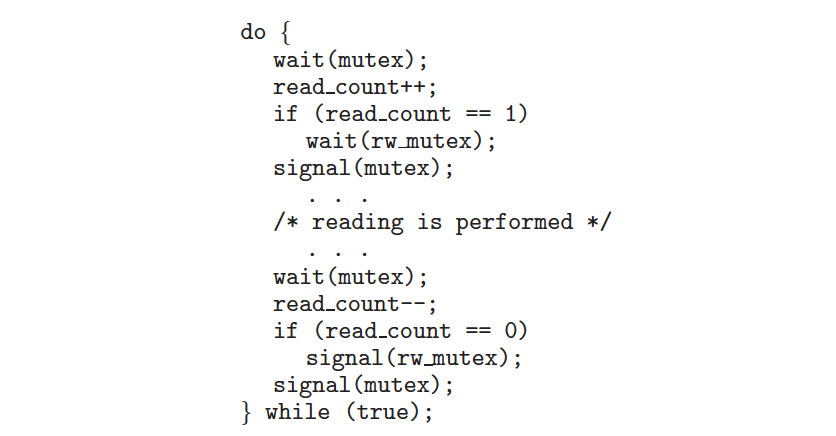 이 해결 방법에는 한 가지 문제점이 존재하는데, 바로 writer가 기아 현상(starvation)을 겪을 수 있다는 점이다. read_count == 0 일 때만 signal(rw_mutex)가 수행되어 대기하고 있던 writer가 수행할 수 있다. 첫 번째 reader(read_count == 1)가 wait(rw_mutex)를 통과하면, 다른 reader들은 writer에 관계없이 계속 진입할 수 있는 구조이다. 여러 reader들이 계속 진입할 경우 read_count == 0 이 더이상 성립하지 않을 수 있고 그러면 writer는 WRITE를 수행할 수 없게 된다.