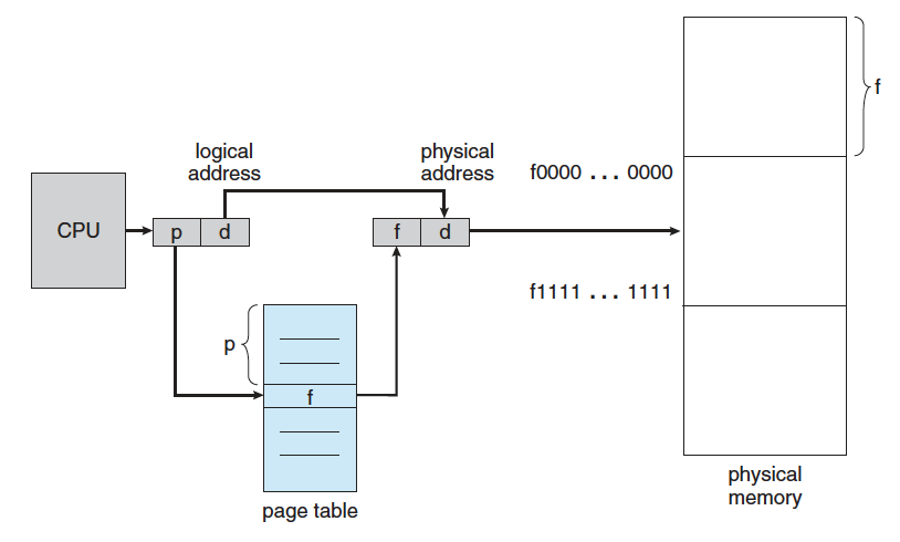 위의 그림은 페이지 테이블을 이용한 주소 변환 과정을 조금 더 자세하게 표현하였다. CPU에서 가상 주소(논리 주소)를 p 페이지의 d 오프셋(p 페이지의 d번째 주소)으로 정의를 하면 페이지 테이블에서 p 페이지 d 오프셋이 f 페이지 d 오프셋(f 페이지의 d번째 주소, d는 변하지 않음)으로 매핑되어 변환됨을 알 수 있다. d가 변하지 않는 이유는 페이지와 프레임의 크기를 똑같이 나누었기 때문이다. 결국 변환된 물리 주소를 가지고 물리 메모리에서 해당 데이터를 참조할 수 있다.