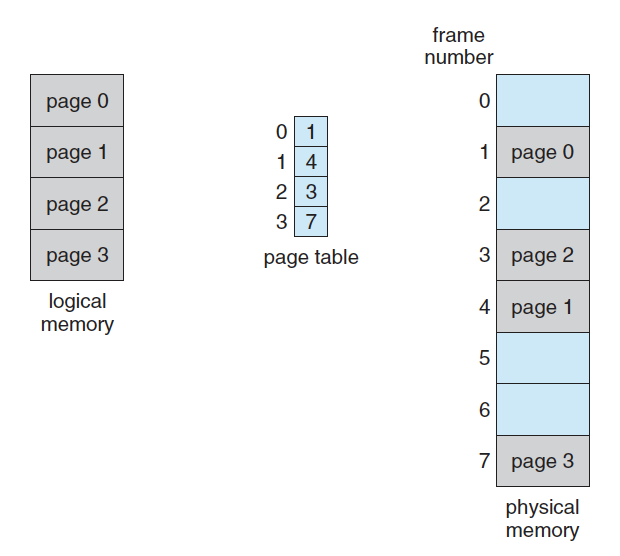 위의 그림을 보면 가상 메모리의 page 0은 page table에서 물리 메모리의 frame 1과 매핑이 됨을 알 수 있다. 참고로 문맥 변환(context switching)을 할 때 마다 페이지 테이블에서 참조하는 주소는 달라진다. 이러한 방법으로 가상 주소가 물리 주소로 변환이 됨을 알 수 있다.