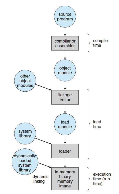 로더 타임(link time)에서는 프로그램의 실행을 위해 loader는 executable을 메모리로 로드한다. 주소 공간 전체가 메모리에 올라간다면, 로드 시에 물리 주소에 대한 바인딩이 일어난다. 프로그램은 relocatable 주소로 되어 있기 때문에 base register를 통해서 물리 주소로 바꾸어 실행하게 된다. 만일 프로그램의 시작 주소를 바꾸려면, 다시 로드를 해야 한다. 실행 타임(execution time)은 프로세스가 실행될 때 물리 주소가 바뀌는 경우, 물리 주소에 대한 binding은 프로세스가 실행될 때 일어난다. 페이징이나 스와핑을 통해서 프로세스가 올려지는 메모리의 물리 주소는 바뀔 수 있다. 이러한 형태의 주소 결정 방법을 사용하기 위해서 MMU와 같은 특별한 하드웨어가 필요하게 된다.