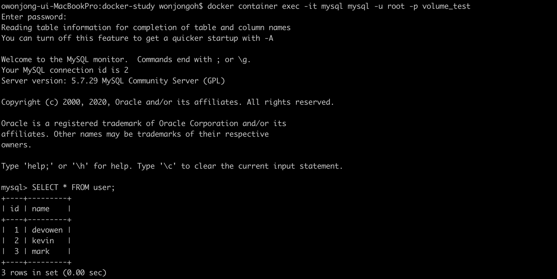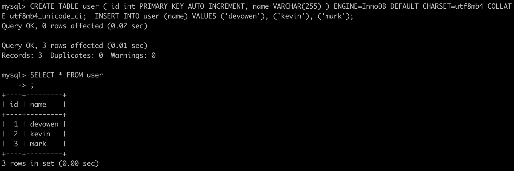 실행중인 MySQL 컨테이너에 root 계정으로 로그인 한다. 패스워드는 빈 문자열이다. 그리고 초기 데이터를 넣고 잘 들어갔는지 확인해 보았다.