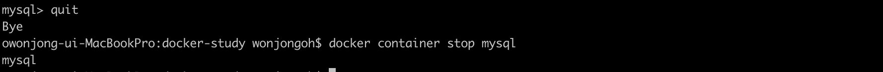 컨테이너를 정지하고 (만들 때 --rm 옵션을 붙여서 실행했으므로 정지와 함께 삭제됨)