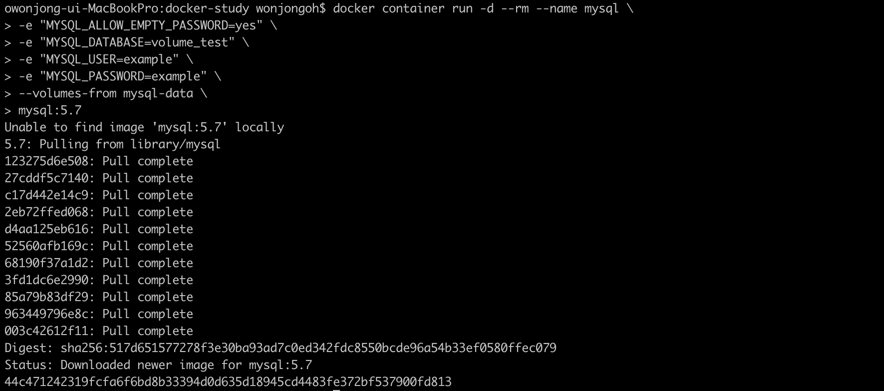 MySQL을 실행시킬 컨테이너를 실행한다. 몇 가지 환경변수를 설정했다.