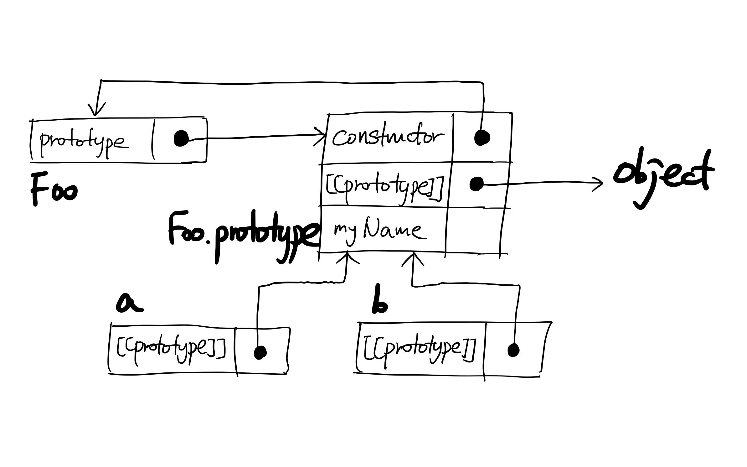 Foo.prototype 객체의 프로퍼티/함수가 a,b 생성 시 각각의 객체로 복사될 거라 짐작하기 쉽지만 절대로 그런 일은 일어나지 않는다. 앞서 설명한 프로토타입의 동작 원리에 따라, a와 b는 생성 직후 각자의 내부 [[Prototype]]이 Foo.prototype에 링크된다. myName은 a, b에서 찾을 수 없으므로 위임을 통해 Foo.prototype에서 찾는다.