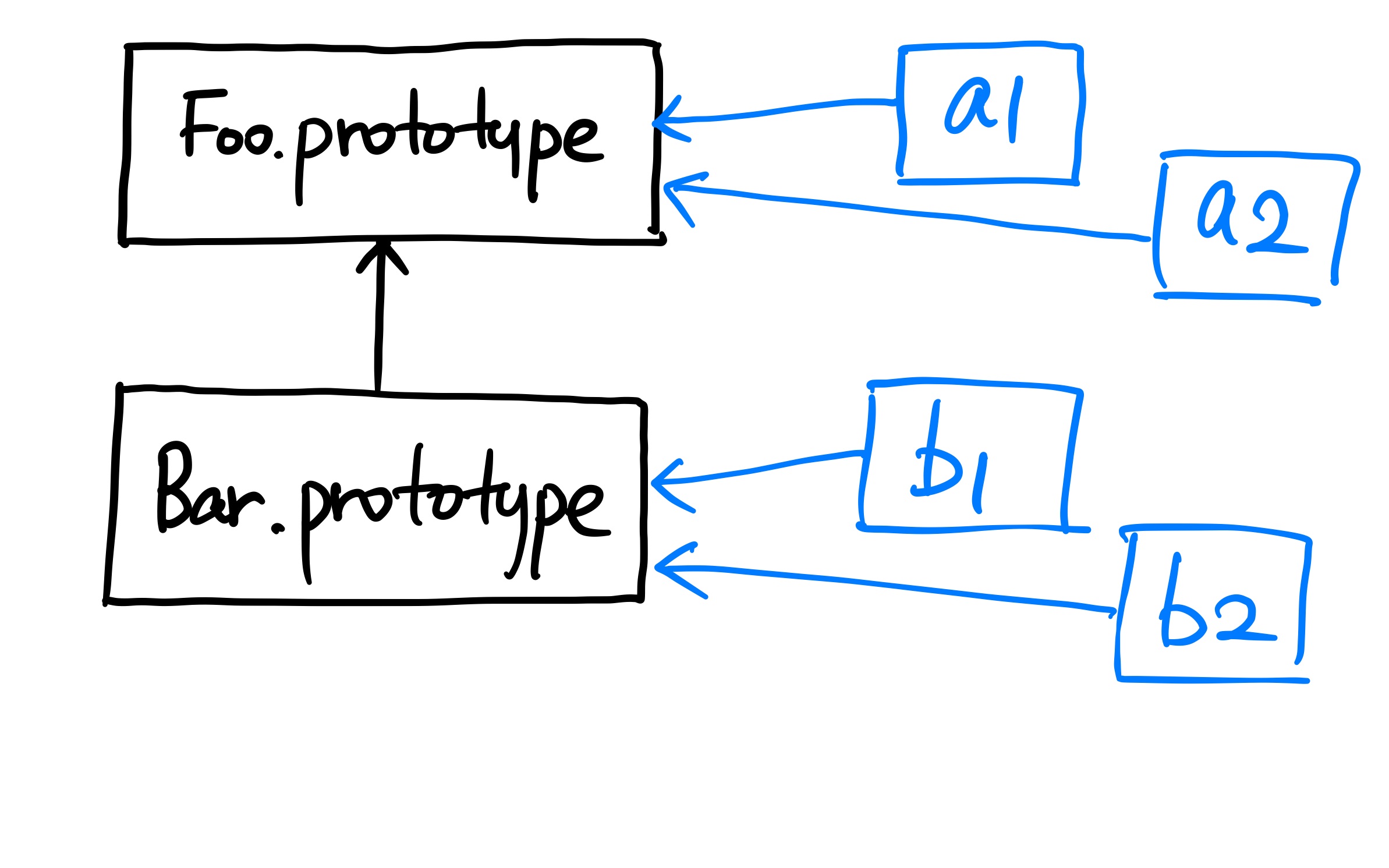 위 그림을 보면 [a1 -> Foo.prototype]뿐 아니라 [Bar.prototype -> Foo.prototype]으로도 위임이 일어나는데, 이는 부모-자식 간의 상속 개념과 유사하다. 화살표는 위임 링크 방향을 나타낸다.