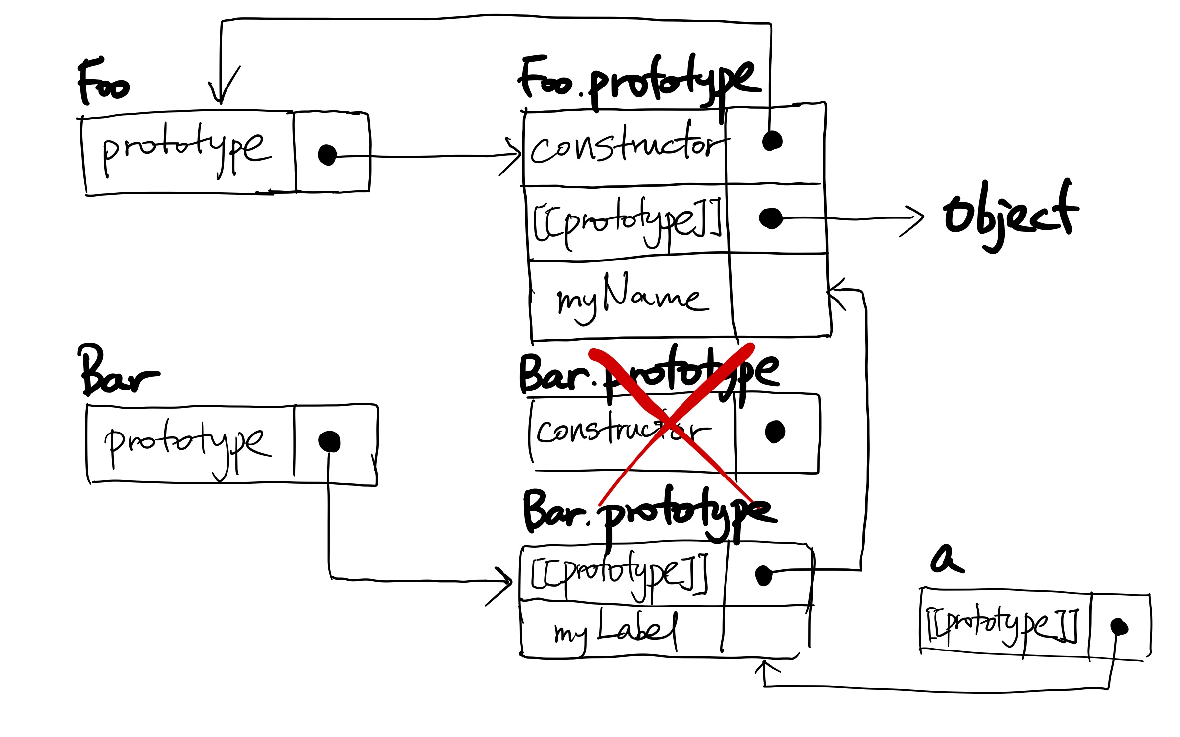 - 자바스크립트 체계가 전통적인 클래스 지향 언어의 '클래스 인스턴스화 및 클래스 상속'과 유사해 보이지만 자바스크립트에서는 복사가 일어나지 않는다는 결정적인 차이가 있다. 그러나 객체는 결국 다른 객체와 내부 [[Prototype]] 연쇄를 통해 연결된다.