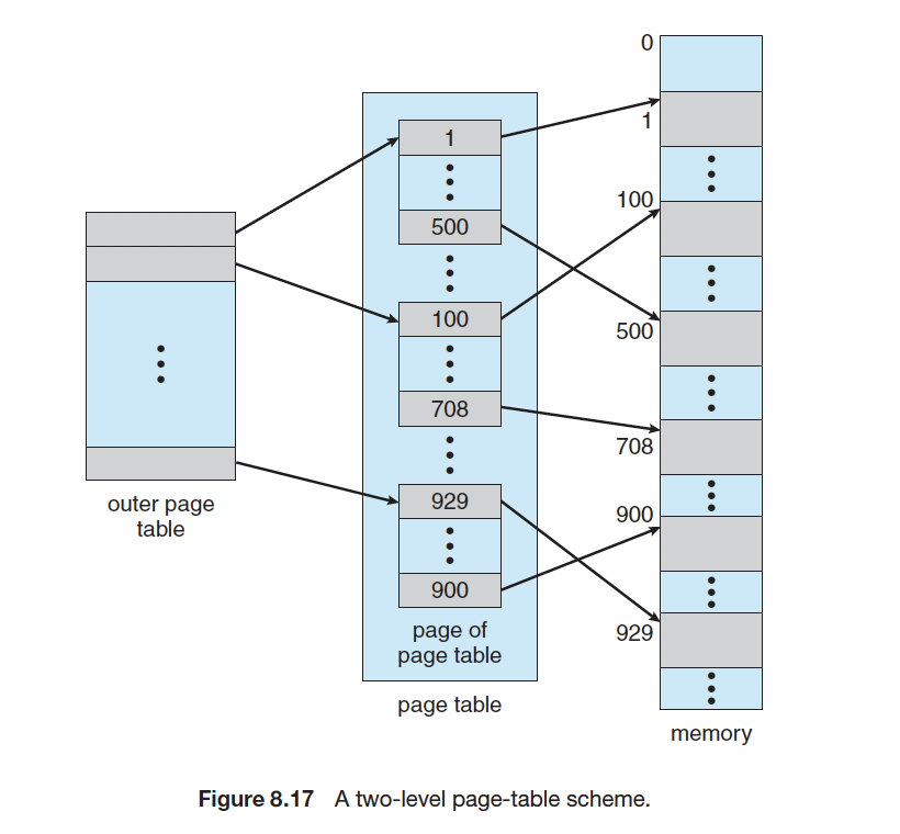 페이지 테이블을 작게 쪼개야 할 필요성이 생겼고 따라서 다 단계 페이지 테이블이 생겨나게 되었다. 예를 들어 2-level page table의 경우 Outer page table을 하나 두어, 페이지 테이블들을 가리키도록 하는 것이다.