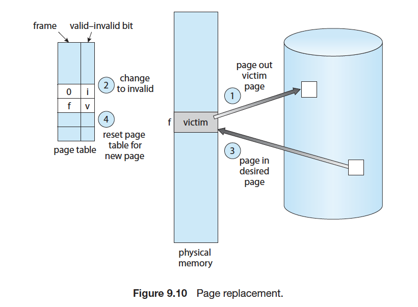 프로세스가 요구한 페이지가 현재 메모리에 없으면 페이지 부재가 발생한다. 페이지 부재가 발생하면 스왑 영역에서 페이지를 메모리로 가져오는데, 만약 메모리가 꽉 찼다면(Over-allocating of memory) 메모리에 있는 페이지를 스왑 영역으로 내보내야 한다. 물리 메모리에 위치한 페이지를 디스크에 저장하고, 요구된 페이지가 해당 프레임을 할당 받도록 하는 방법을 페이지 교체라고 한다.