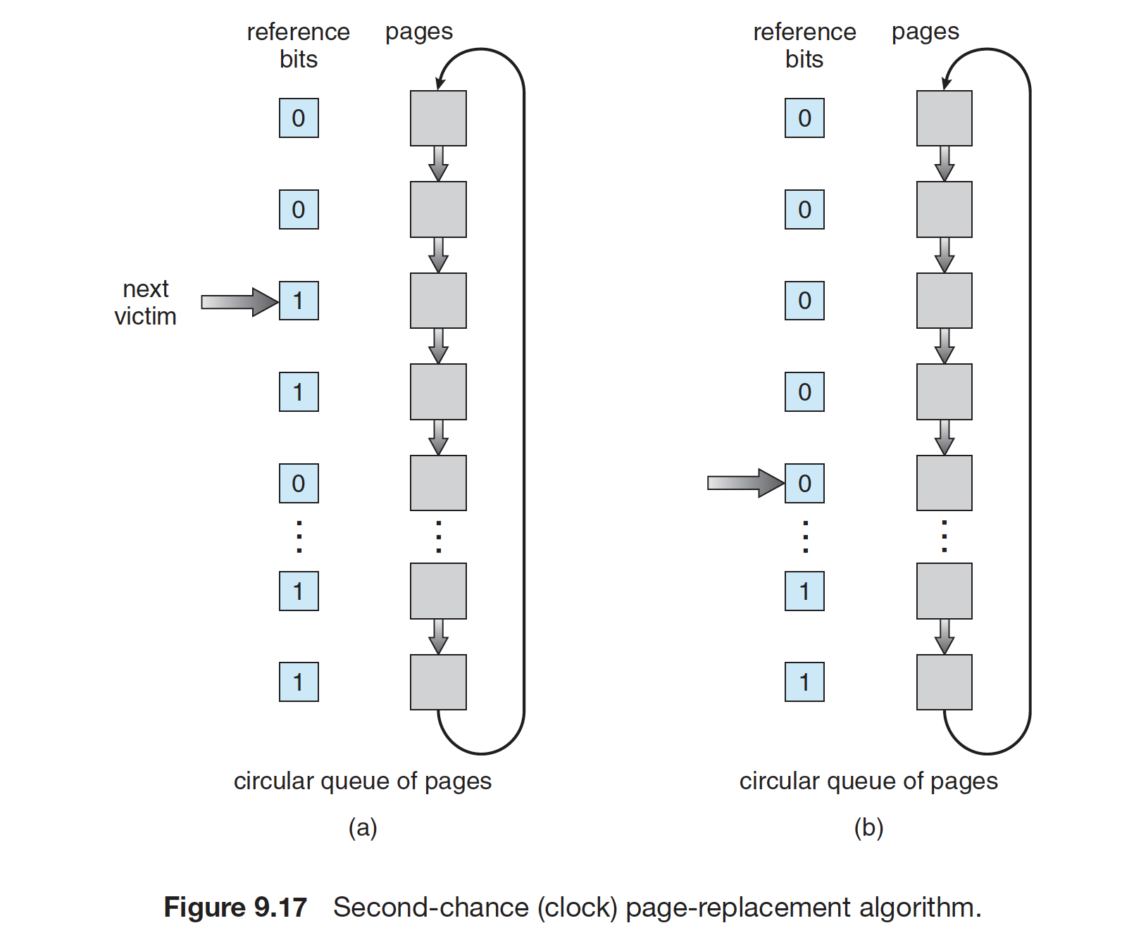 시계 알고리즘 역시 FIFO의 변형 알고리즘으로 SCR의 발전된 형태이다. 시계 알고리즘은 원형 큐를 사용한다. 여기서는 스왑 영역으로 옮길 대상 페이지를 가리키는 포인터를 사용하는데, 이 포인터가 큐의 맨 바닥으로 내려가면 다음번에는 다시 큐의 처음을 가리키게 된다. 이 알고리즘도 참조 비트를 사용한다. 참조 비트의 초기값은 0이고, 메모리에 있는 페이지를 성공적으로 참조하면 0에서 1로 변경된다.