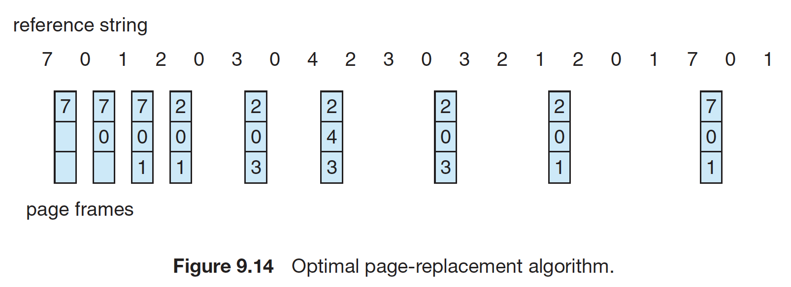 최적 알고리즘은 앞으로 사용하지 않을 페이지를 스왑 영역으로 옮긴다. 메모리가 앞으로 사용하지 않을 페이지를 미리 살펴보고 페이지 교체 선정 시점부터 사용 시점까지 가장 멀리 있는 페이지를 대상 페이지로 선정한다. 아래의 예제를 보면 4번째 메모리 접근 순서에서 2가 들어오는데, 이 때를 기준으로 0은 5번째에서, 1은 14번째에서 7은 18번째에서 사용되므로 7을 2로 바꾼다. 이는 모든 알고리즘 중 가장 낮은 page fault를 가지는 최적의 알고리즘이다. 하지만 앞으로 어떤 페이지가 사용될지는 미리 알 수가 없다. 따라서 실제로 구현할 수는 없다.