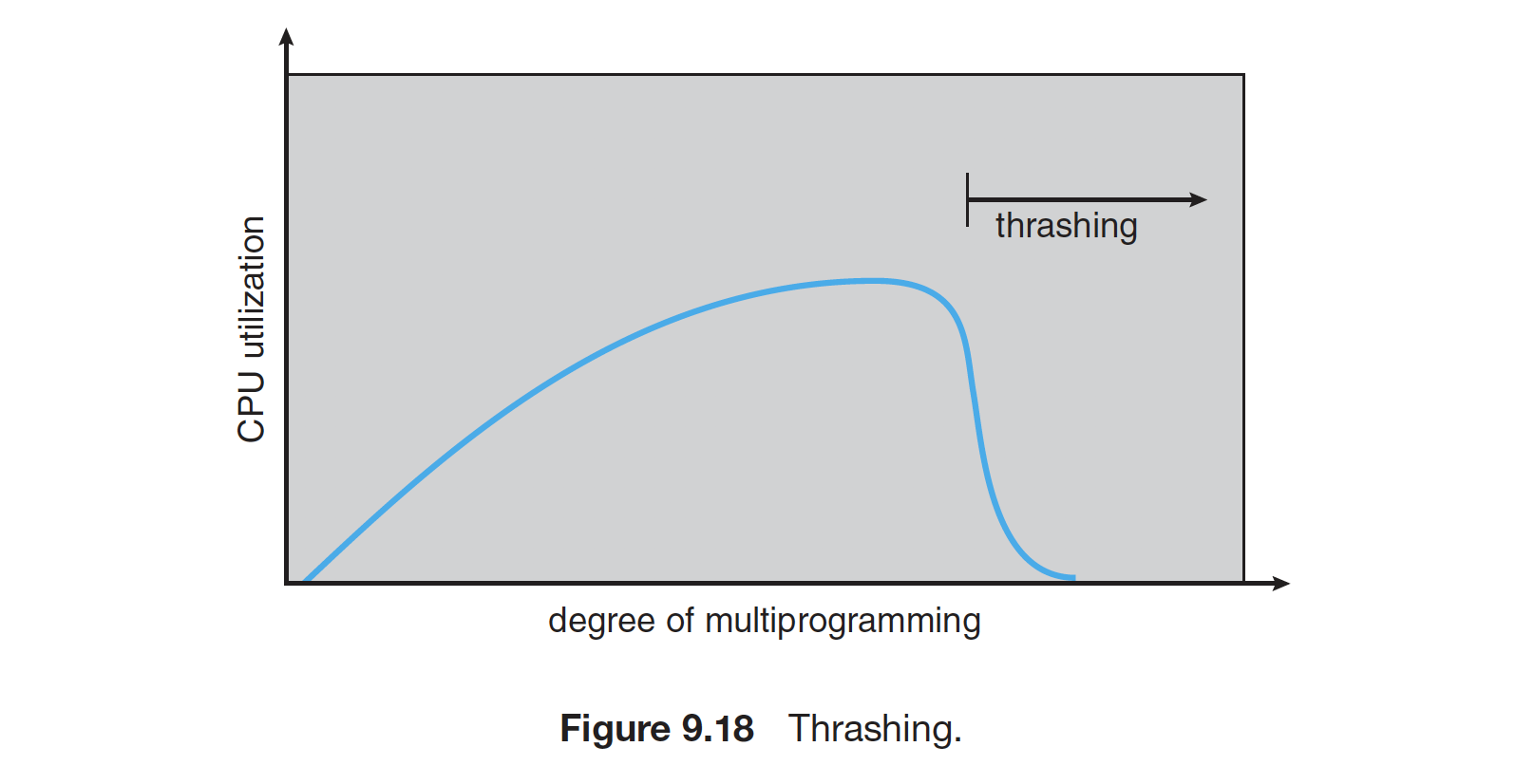 스레싱은 메모리가 일정할 경우 멀티 프로그램의 수와 밀접한 관계가 있다. 동시에 실행하는 프로그램의 수를 멀티프로그래밍 정도라고 하는데, 멀티프로그래밍 정도가 너무 높으면 스레싱이 발생한다. 아래 그래프에서 CPU 활용률이 증가하다 꺾이는 지점을 스레싱 발생 지점이라고 한다.