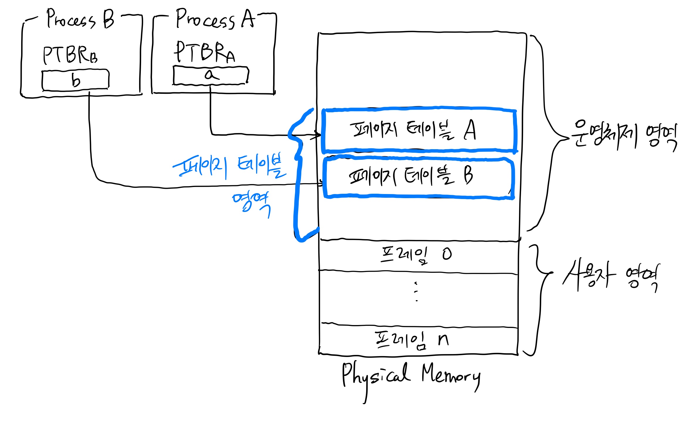 프로세스는 페이지 테이블에 빠르게 접근하기 위해 레지스터가 존재한다. 각 프로세스가 메모리에 접근하려고 할 때 메모리 관리자는 페이지 테이블의 위치를 빠르게 파악해야 할 필요가 있기에, 각 페이지 테이블의 시작 주소를 페이지 테이블 기준 레지스터(Page Table Base Register, PTBR)에 보관한다. 페이지 테이블 기준 레지스터는 각 프로세스의 프로세스 제어 블록에 저장되는 데이터로, 물리 메모리 내에 피이지 테이블의 시작 주소를 가지고 있다.