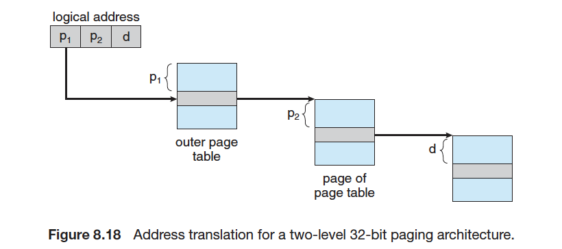 페이지 테이블을 작게 쪼개야 할 필요성이 생겼고 따라서 다 단계 페이지 테이블이 생겨나게 되었다. 예를 들어 2-level page table의 경우 Outer page table을 하나 두어, 페이지 테이블들을 가리키도록 하는 것이다.