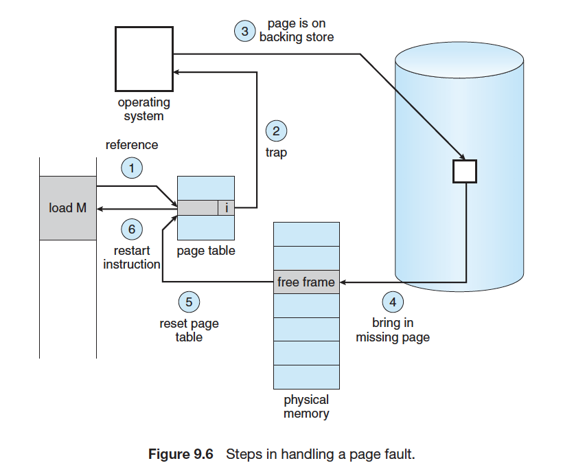 페이지 부재가 발생한 경우 프레임을 새로 할당 받아야 한다. 그리고 프로세스가 해당 페이지를 사용할 수 있도록 스왑 영역에서 물리 메모리로 옮겨야 한다. 그리고 페이지 테이블을 재구성 하고, 프로세스의 작업을 재시작한다. 이러한 작업은 Page Fault Handler에서 수행한다.