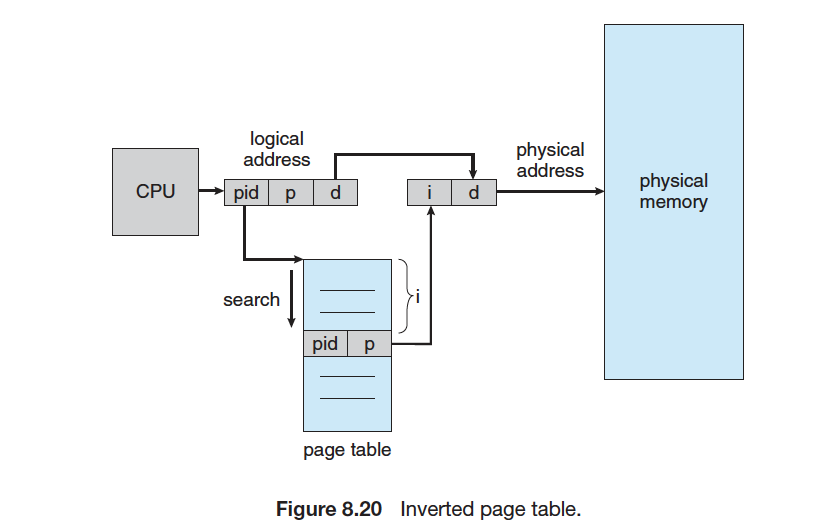 시스템 전체에 하나의 페이지 테이블만 둔다. 페이지 테이블 인덱스는 프레임 번호이고, 페이지 테이블 내용은 프로세스 번호(Process ID)와 페이지 번호이다. 페이지 테이블은 훨씬 적은 용량을 차지하지만, 테이블을 검색하는데 시간이 오래 걸린다는 단점이 있다.
