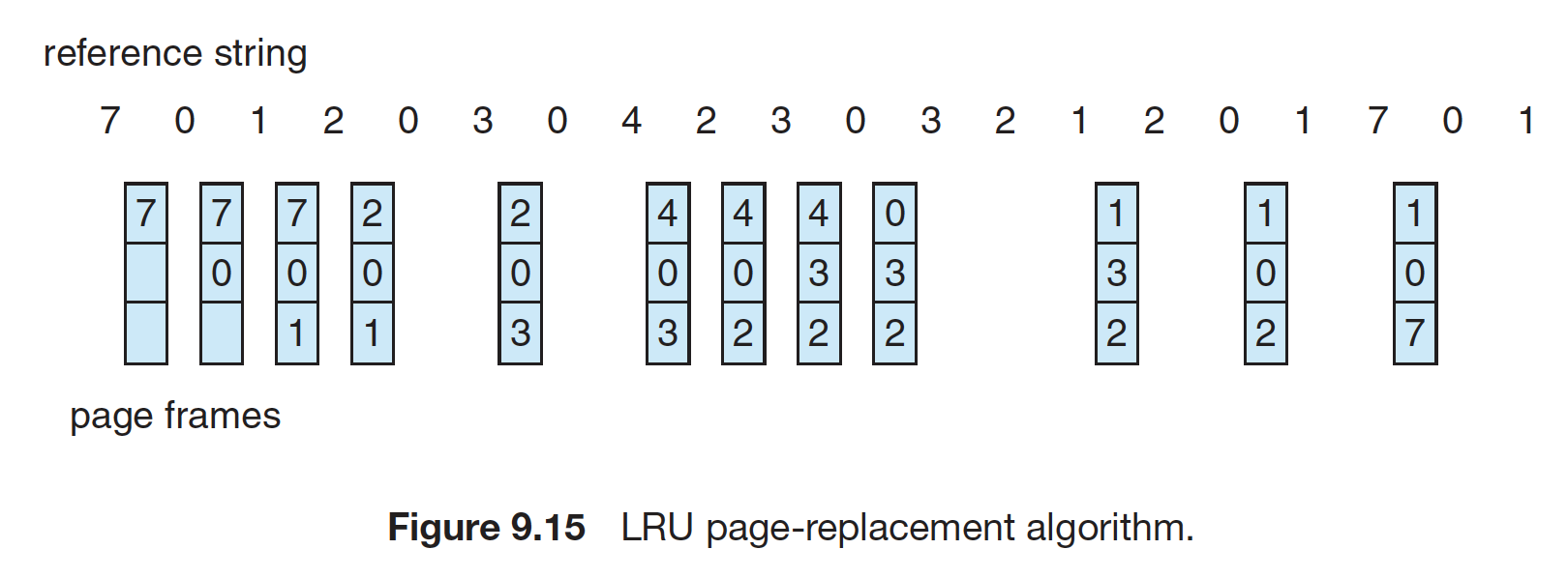 최근 최소 사용(LRU, Least Recently Used) 페이지 교체 알고리즘은 메모리에 올라온 후 가장 오랫동안 사용되지 않은 페이지를 스왑 영역으로 넘긴다. 즉, 최근에 사용된 페이지는 놔두고, 가장 오래 전에 사용된 페이지를 대상 페이지로 선정한다는 의미이다. 페이지 접근 시간에 따라서 또는 카운터나 참조 비트를 사용하여 구현하는 방법 등이 있다.