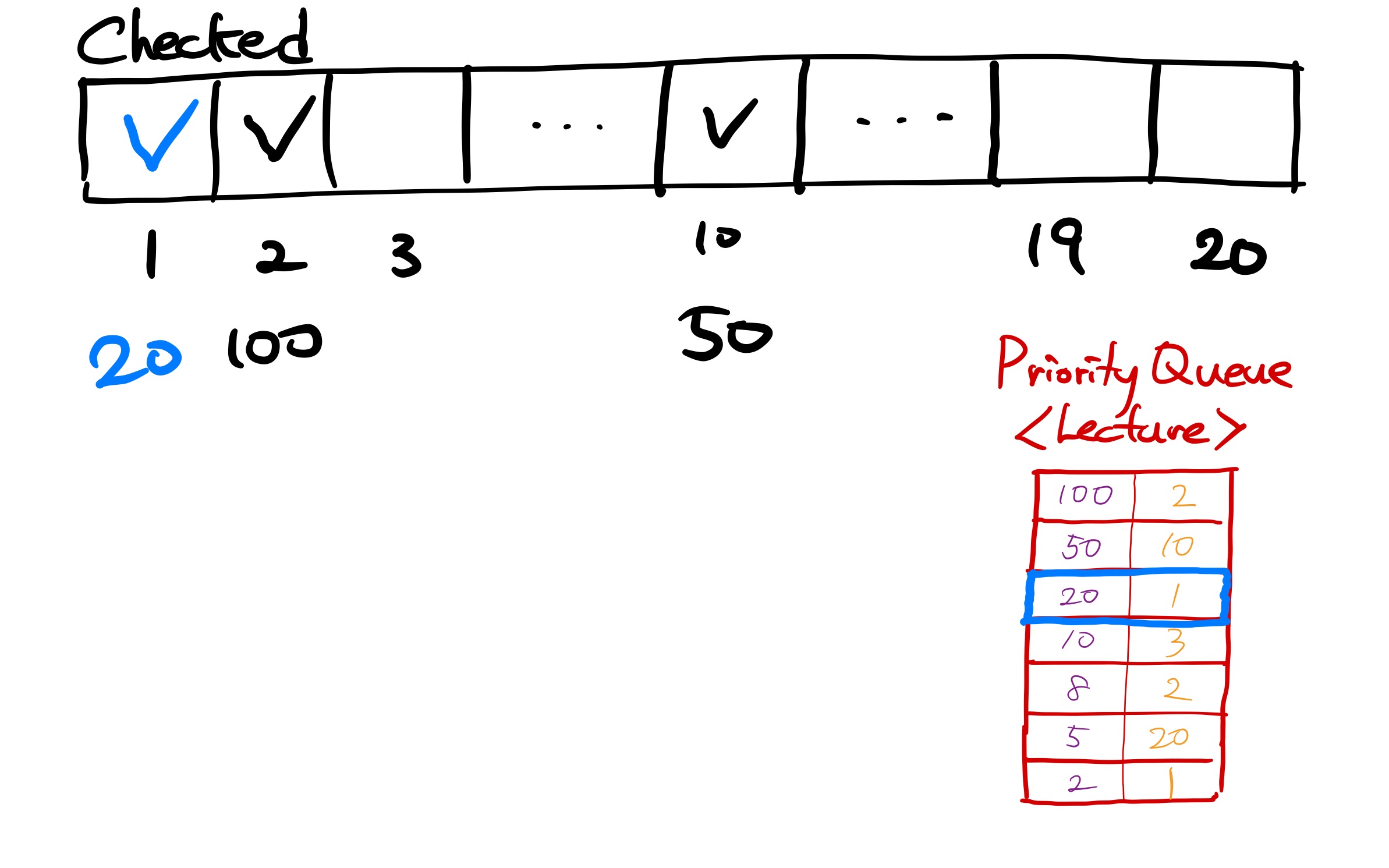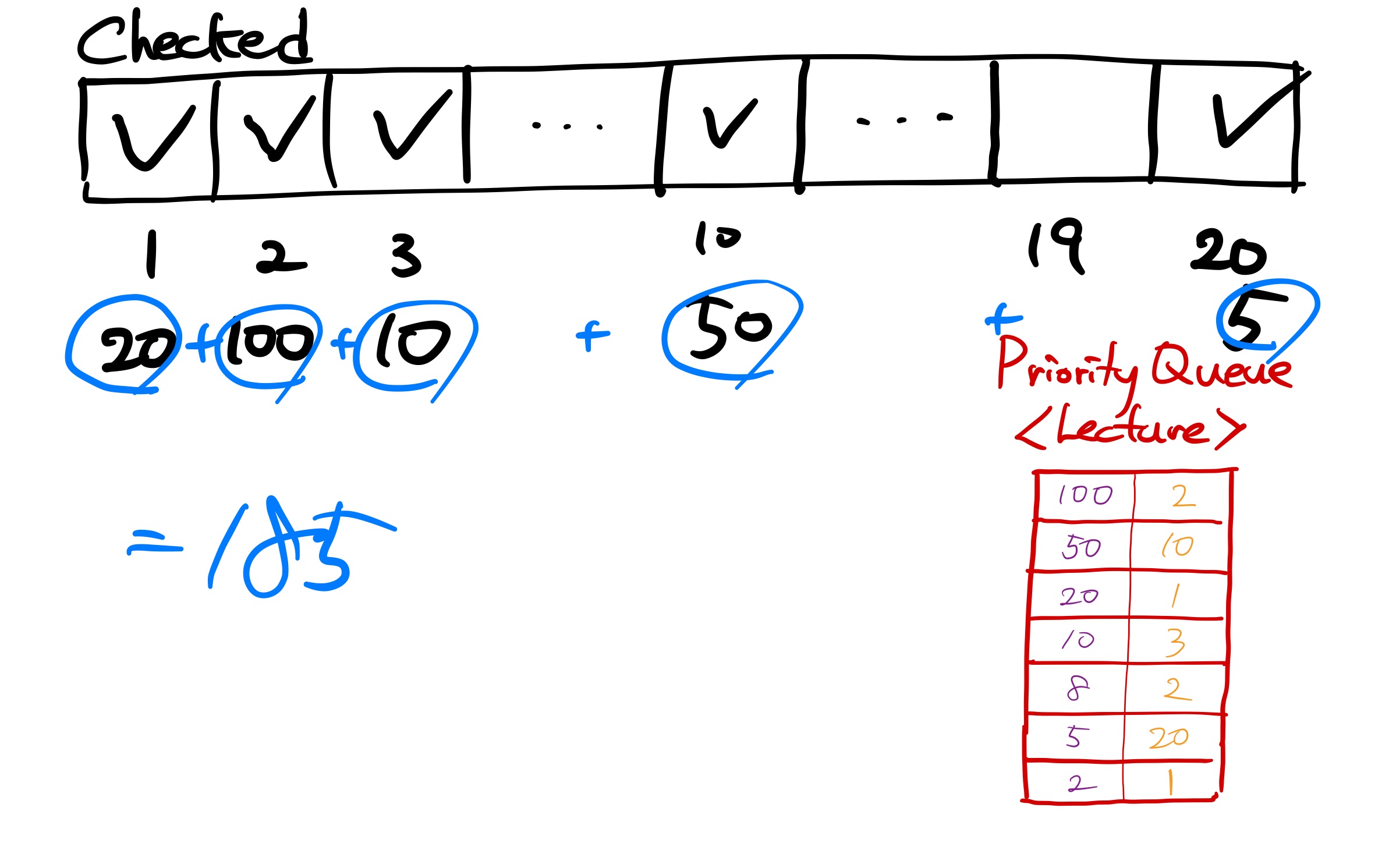 세 번째 강연을 꺼내본다. 세 번째 강연은 강연료 20에 날짜 제한이 1일이다.1일이 비어있으므로 여기에 두 번째 강연을 넣고 checked[1] = true로 바꾸어 준다. 현재까지 강연료 합은 170이다.