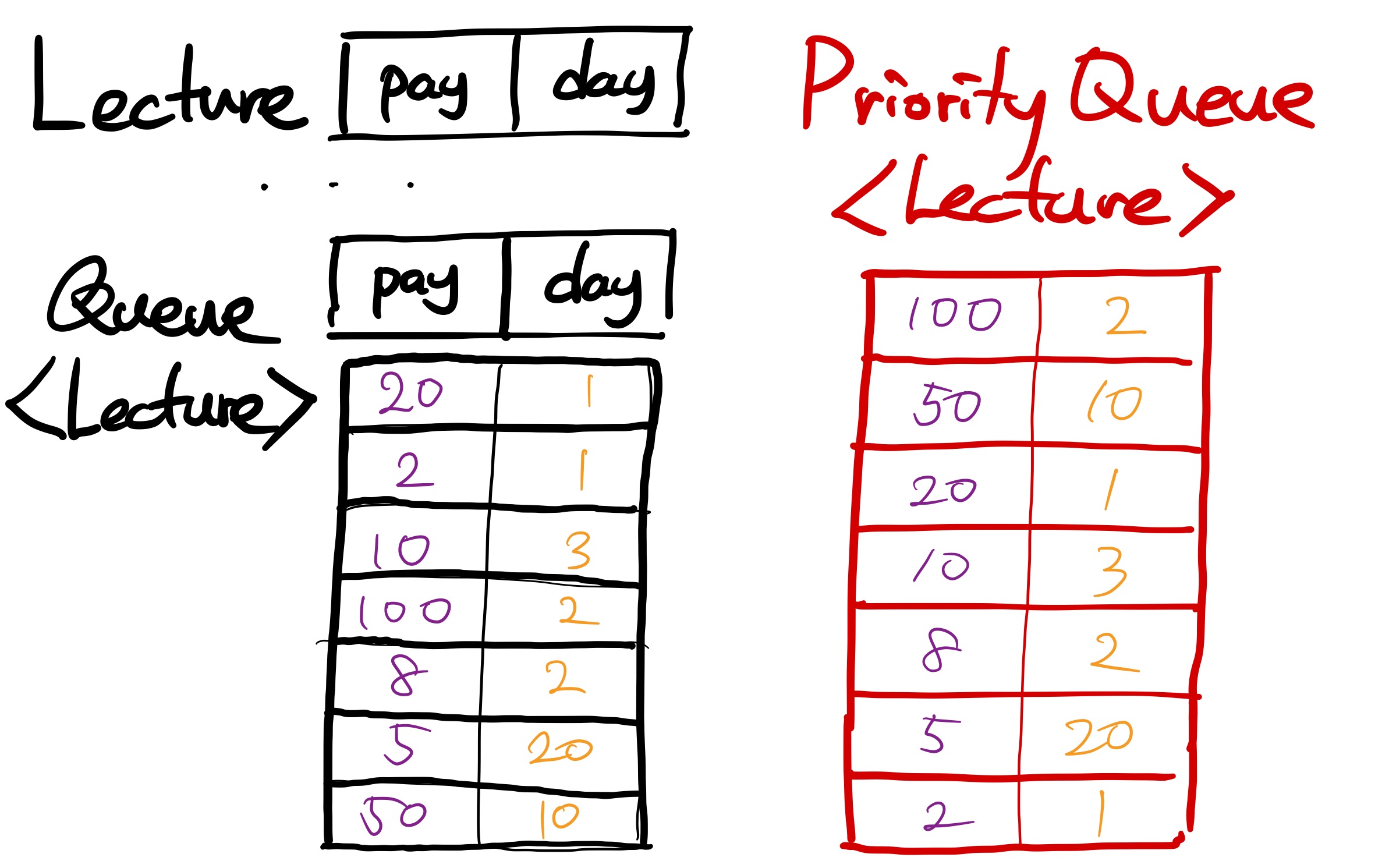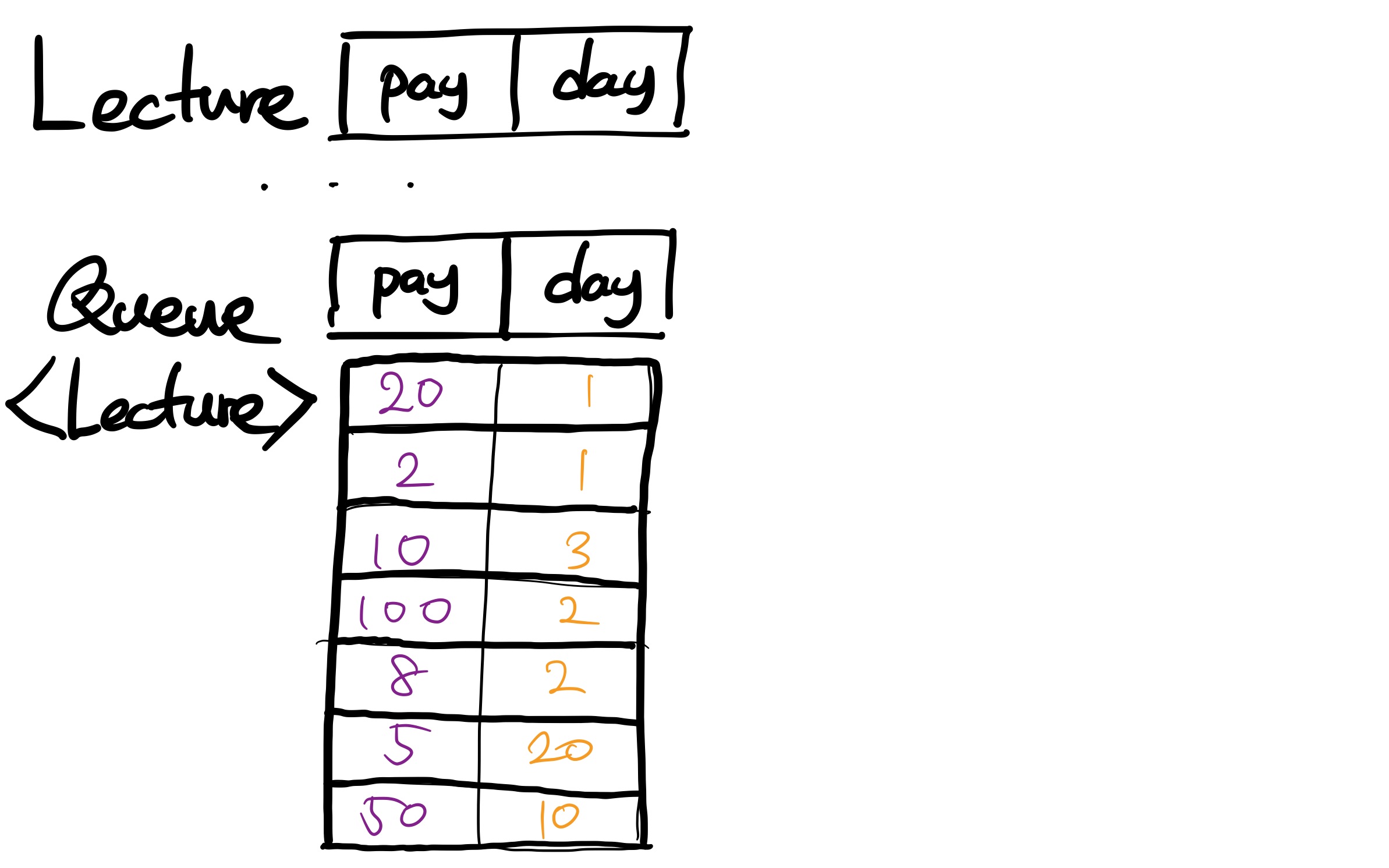 우선 Lecture 라는 클래스를 먼저 만들고, 여기에 pay와 day라는 프로퍼티를 넣는다. 그리고 하나의 강의를 Lecture 객체로 만들어서 큐에 넣으면 좋을 것 같다는 생각을 했다.