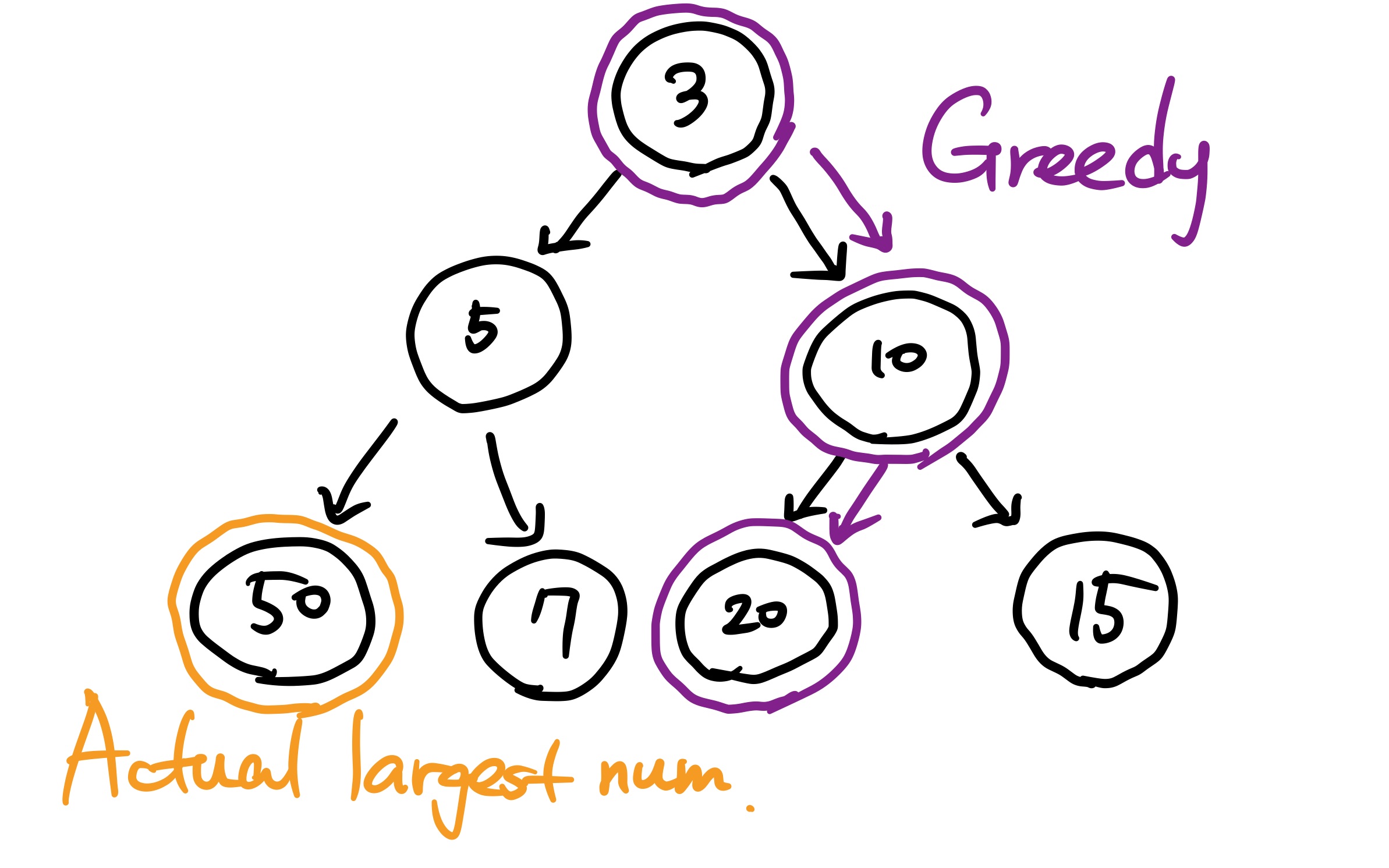 예를 들면 이런 경우다. 그리디 알고리즘으로 매 순간 순간 최선의 선택을 하면 3 -> 10 -> 20 으로 선택을 하지만, 실제 가장 큰 숫자는 50인 것처럼 말이다. 이처럼 그리디 알고리즘으로 전체 문제의 최적의 답을 찾지 못하는 경우도 발생한다.